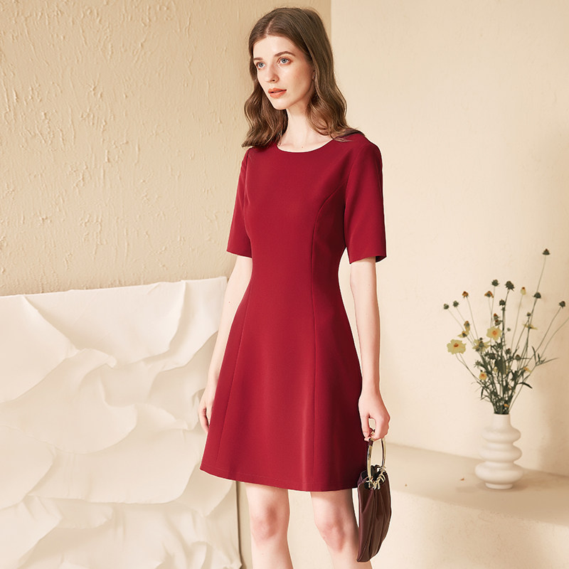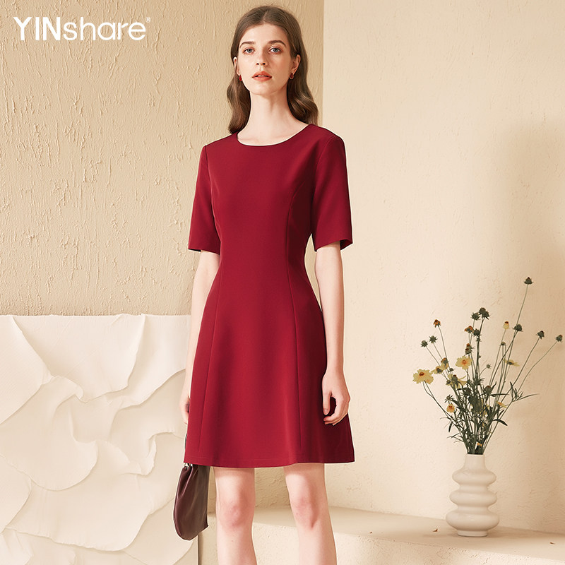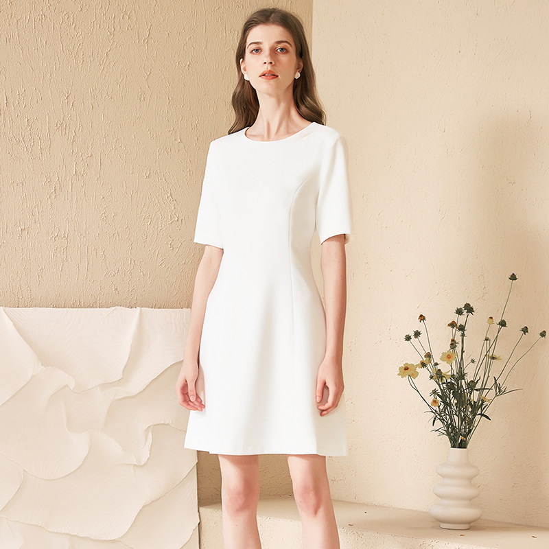 映想春秋季修身女白色连衣裙简约短袖年会小白裙