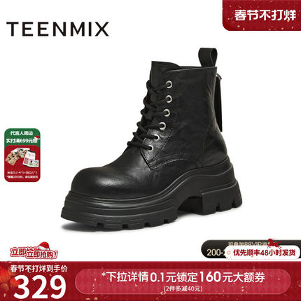 天美意厚底增高复古马丁靴大黄靴工装靴女加绒短靴皮靴2025冬新款