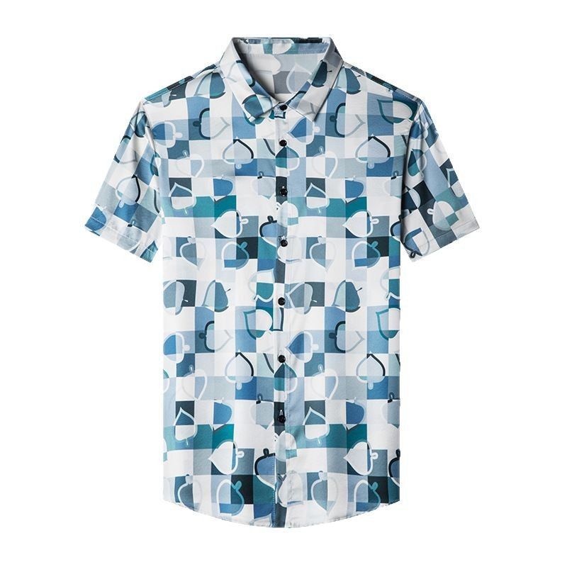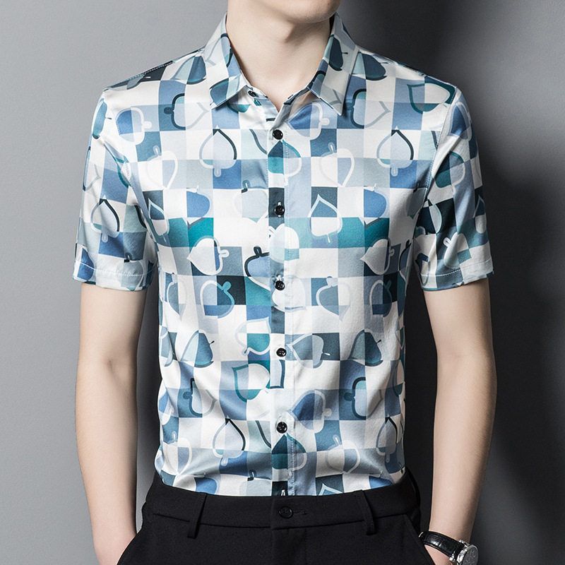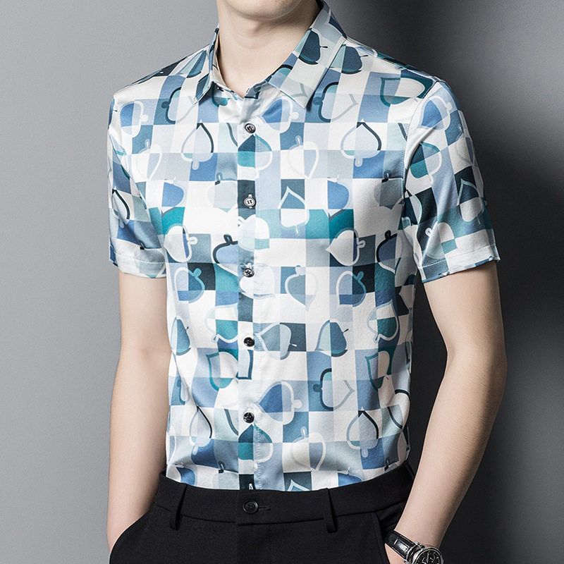 真丝桑蚕丝休闲衬衫男士短袖薄款绸缎面上衣清爽透气夏季花衬衣男