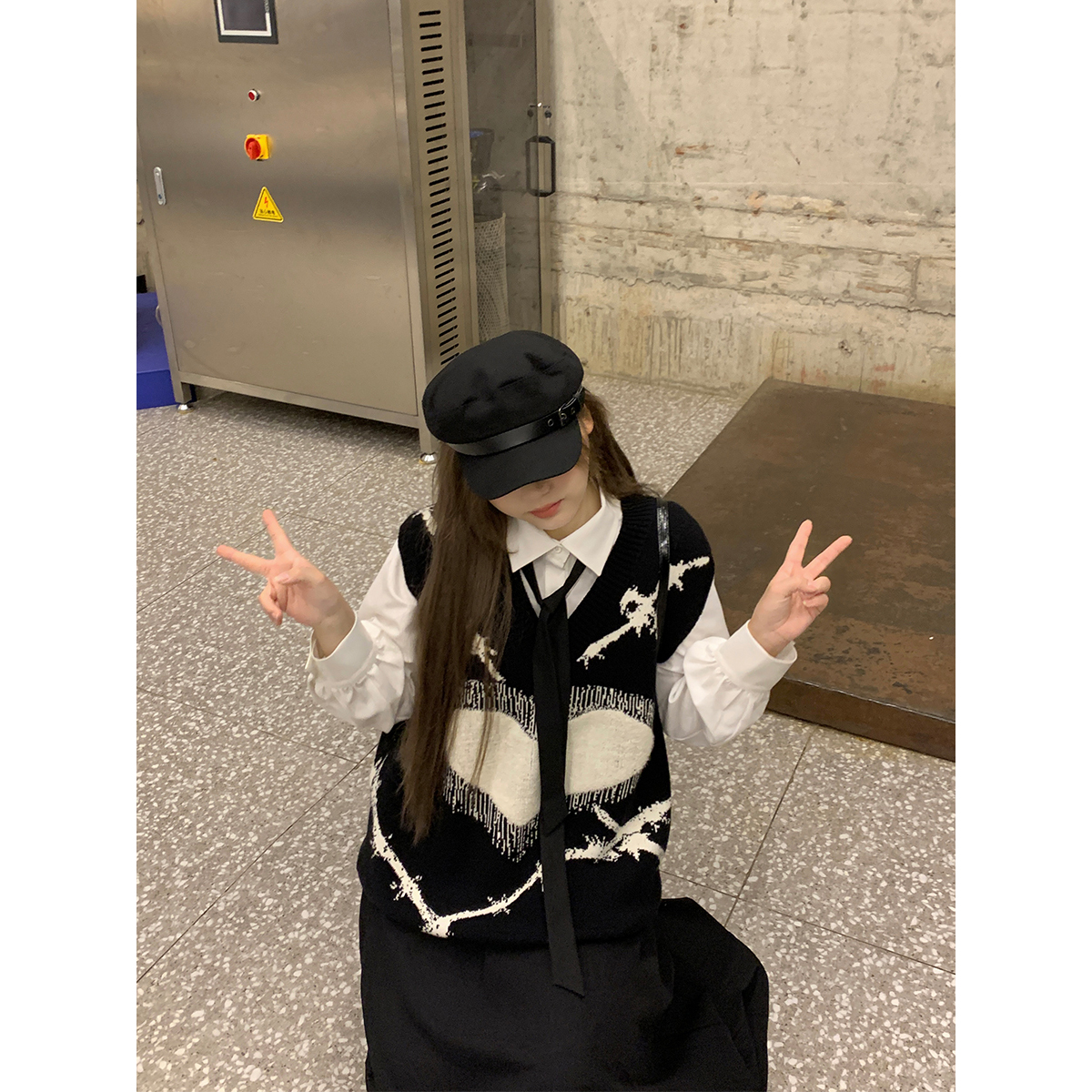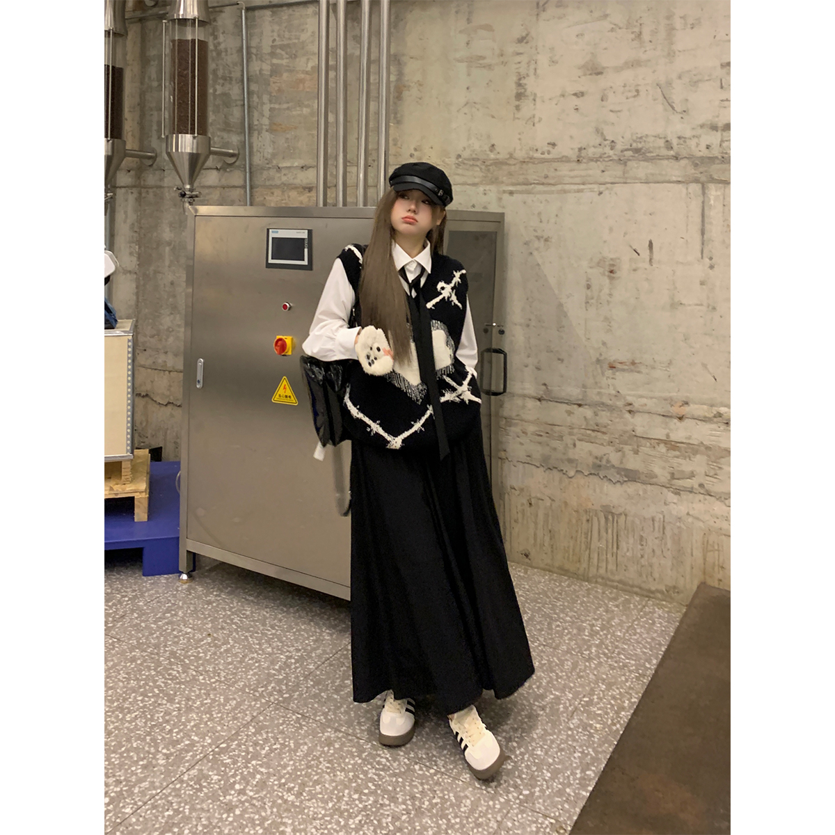 安妮不火 学院风显瘦套装女2025秋冬新款微胖大码黑白马甲针织衫