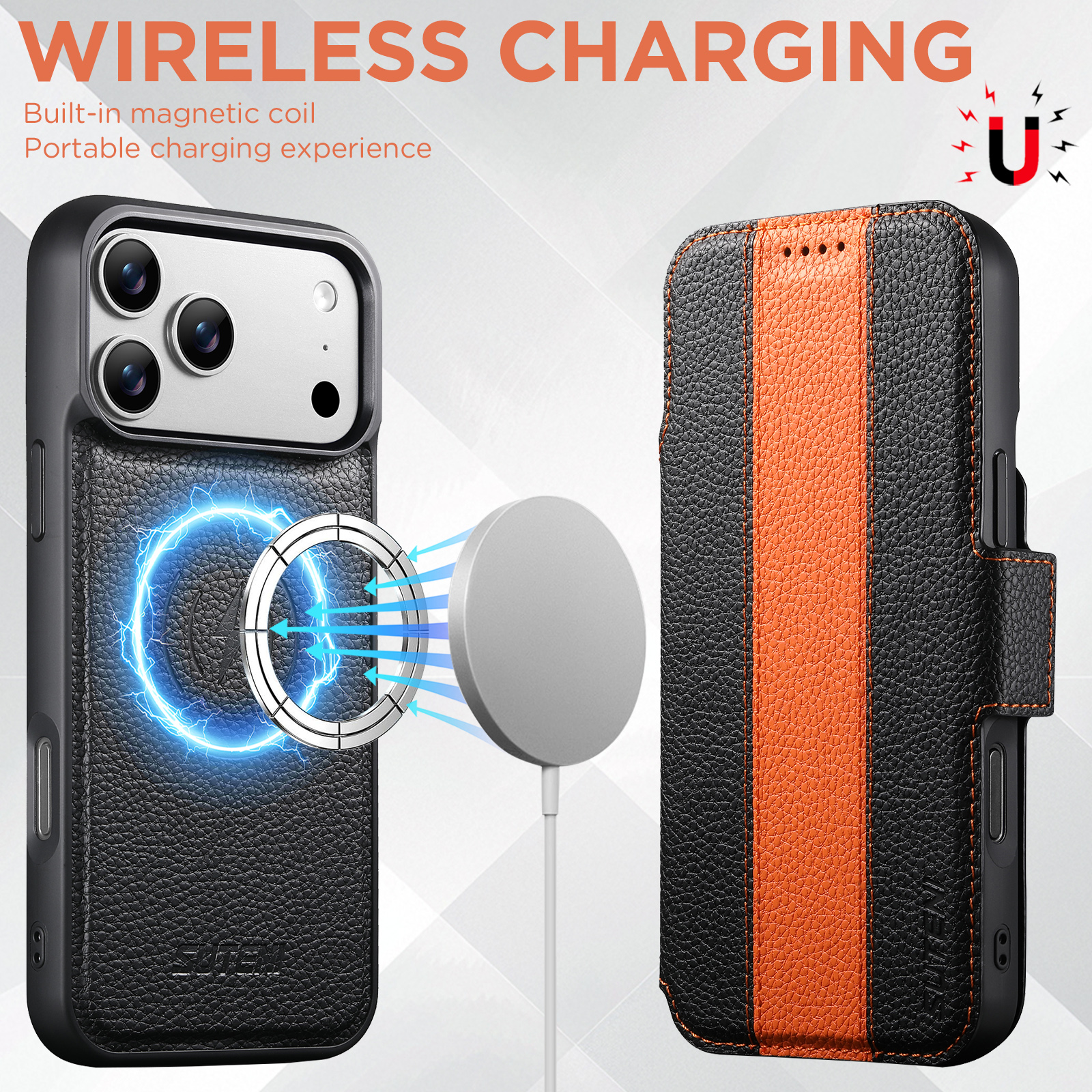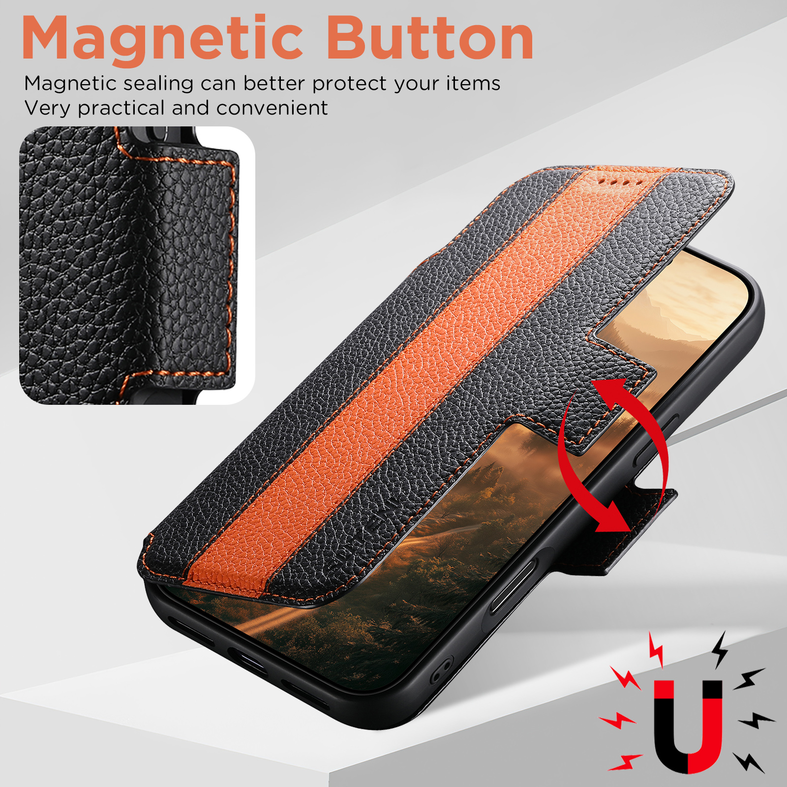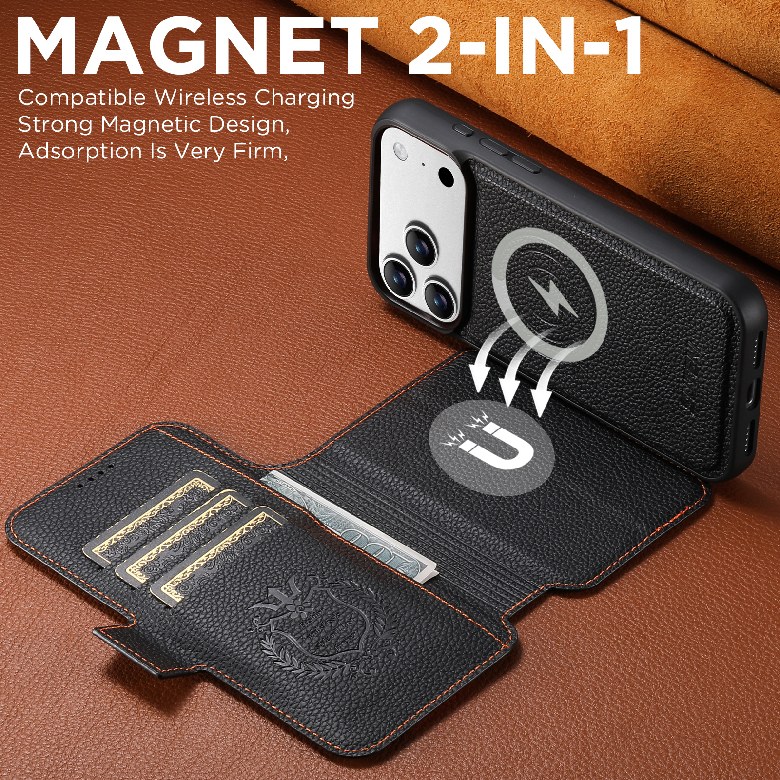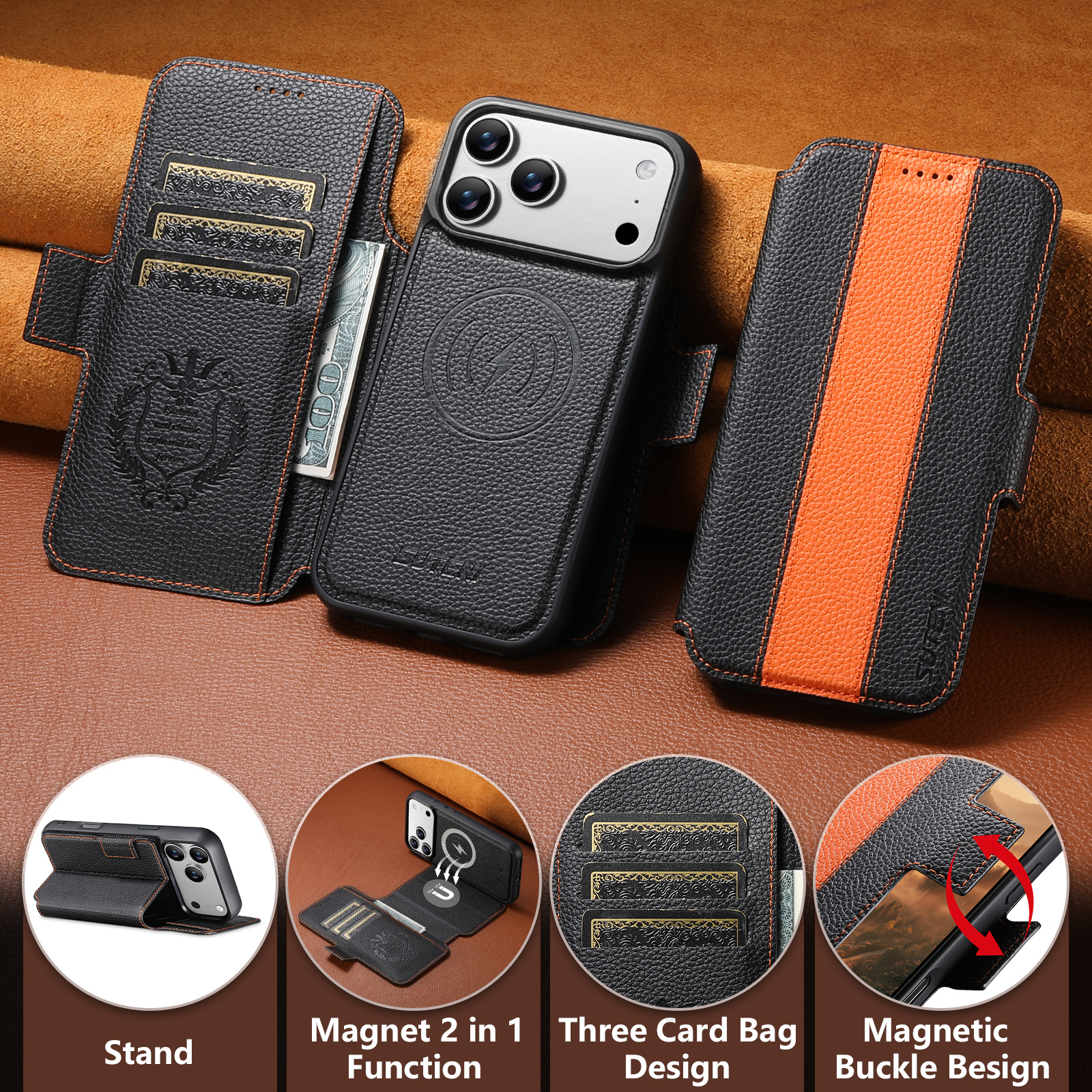 适用苹果17ProMax手机壳侧扣磁吸翻盖皮套苹果16Pro可拆分保护套iPhone15荔枝纹皮壳Magsafe苹果13/14赛道壳