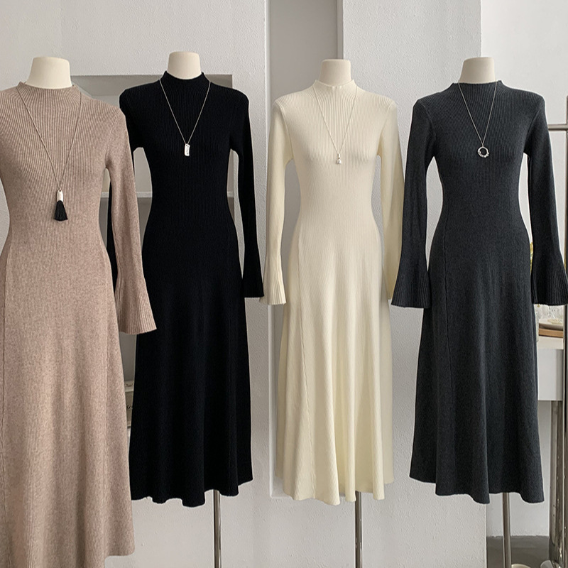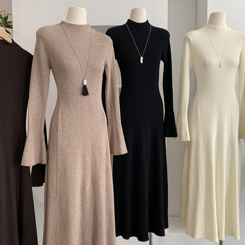 十三行欧货~立领气质显瘦纯色喇叭长袖针织连衣裙长款毛衣裙长裙