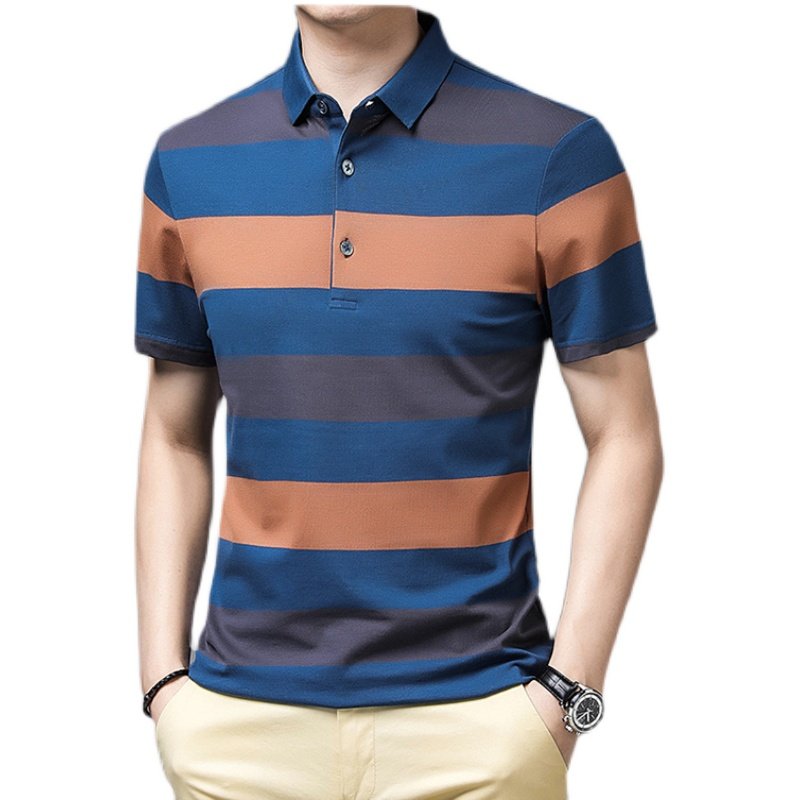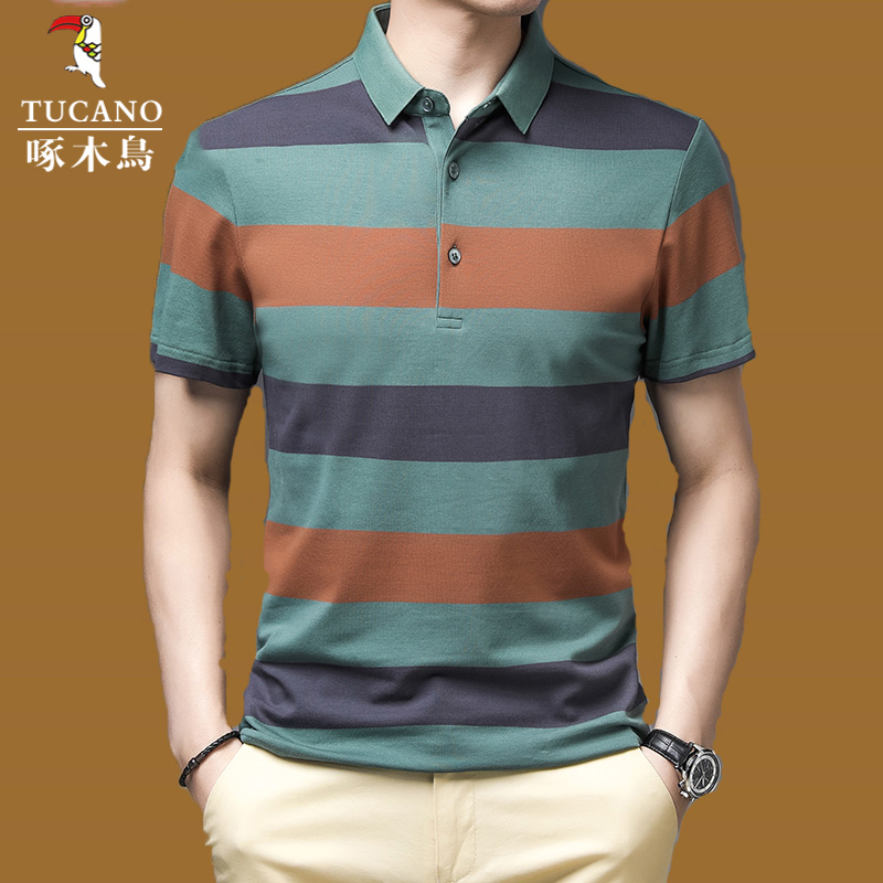 啄木鸟纯棉翻领短袖T恤男冰丝宽松条纹POLO衫中年丝光棉爸爸装潮
