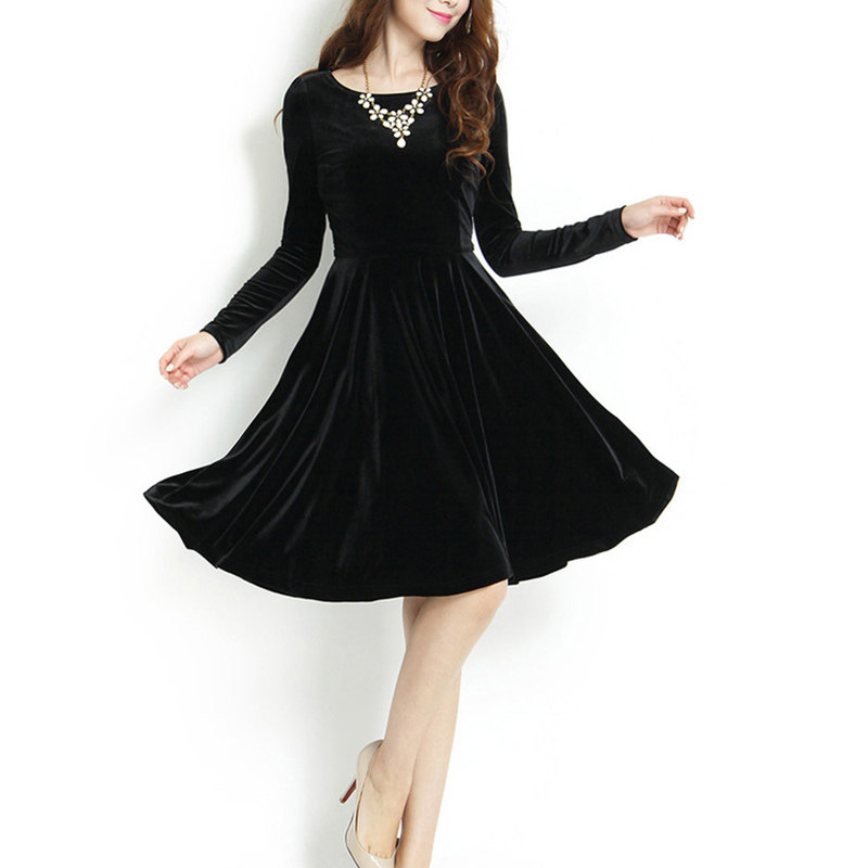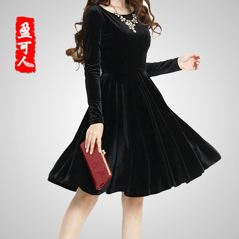 盈可人秋冬新款大码修身大摆型收腰显瘦金丝绒时尚长袖连衣裙