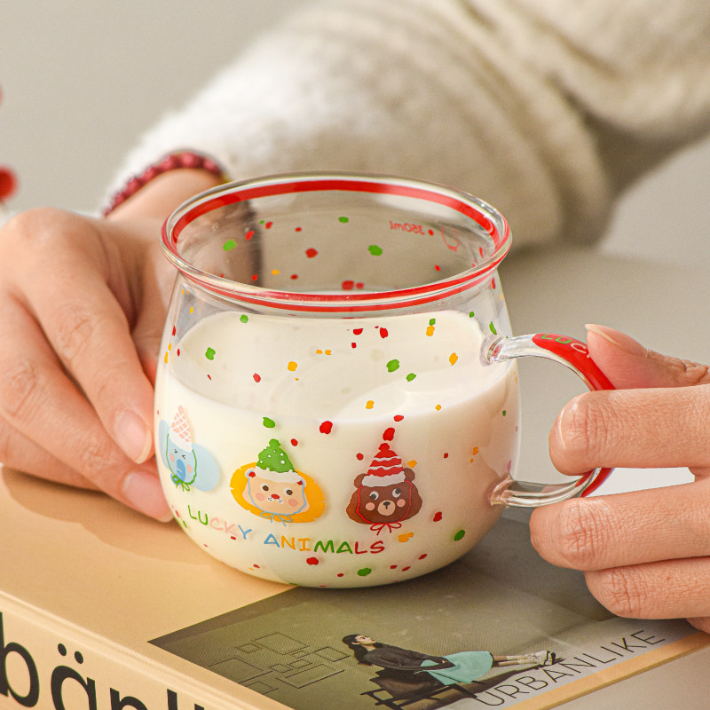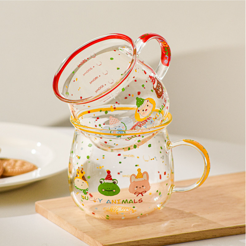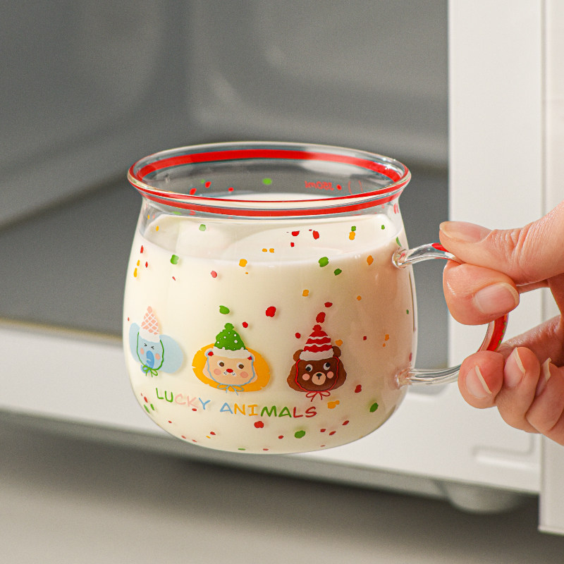 儿童早餐牛奶杯高硼硅玻璃带刻度耐高温可爱卡通杯子可微波炉加热