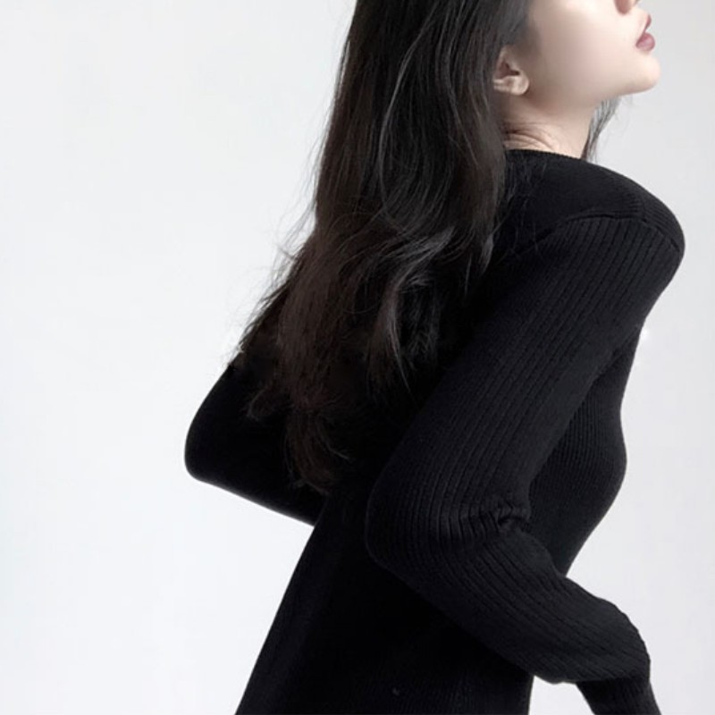 高端定制网红女神精品春秋长袖打底裙黑色V领露肩修身针织连衣裙