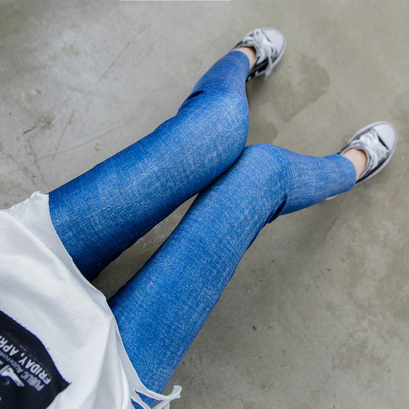 夏季女裤牛奶丝仿牛仔印花打底裤高腰外穿弹力九分薄款小脚裤大码