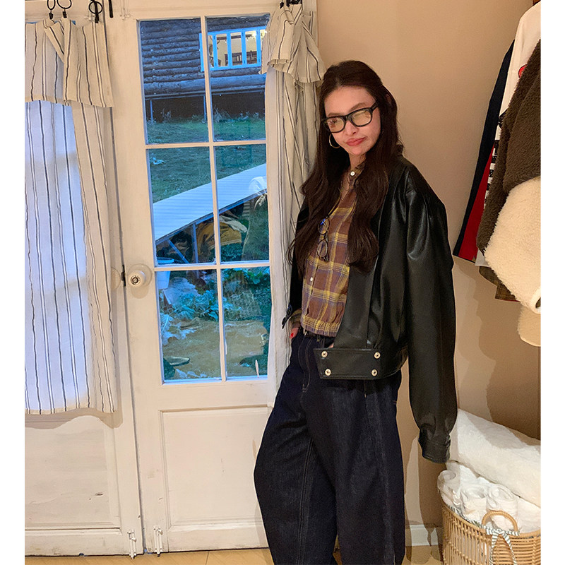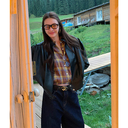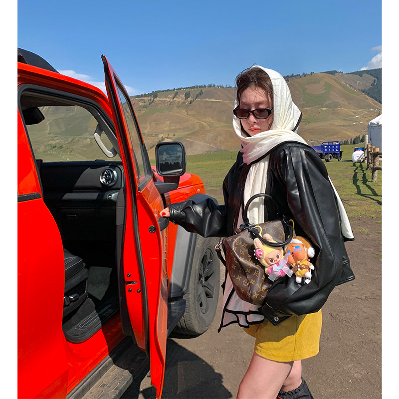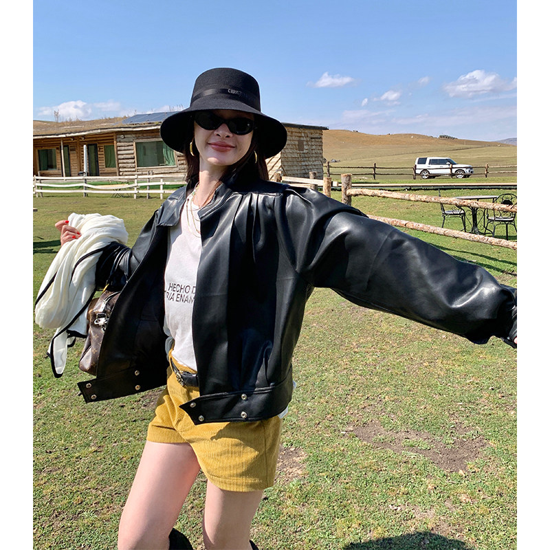 tingtings 黑色立领廓形皮衣女秋季新款pu皮夹克外套美式机车上衣