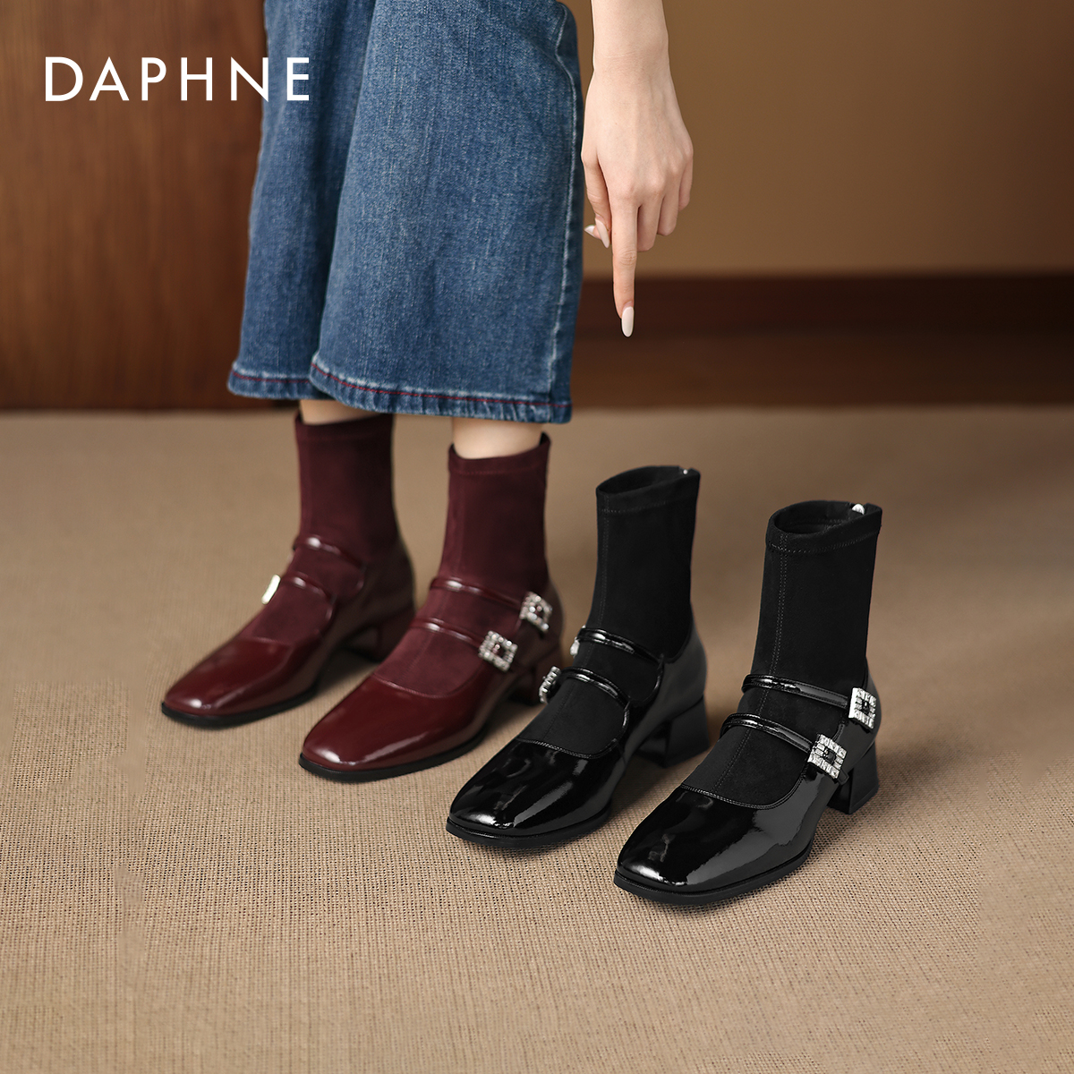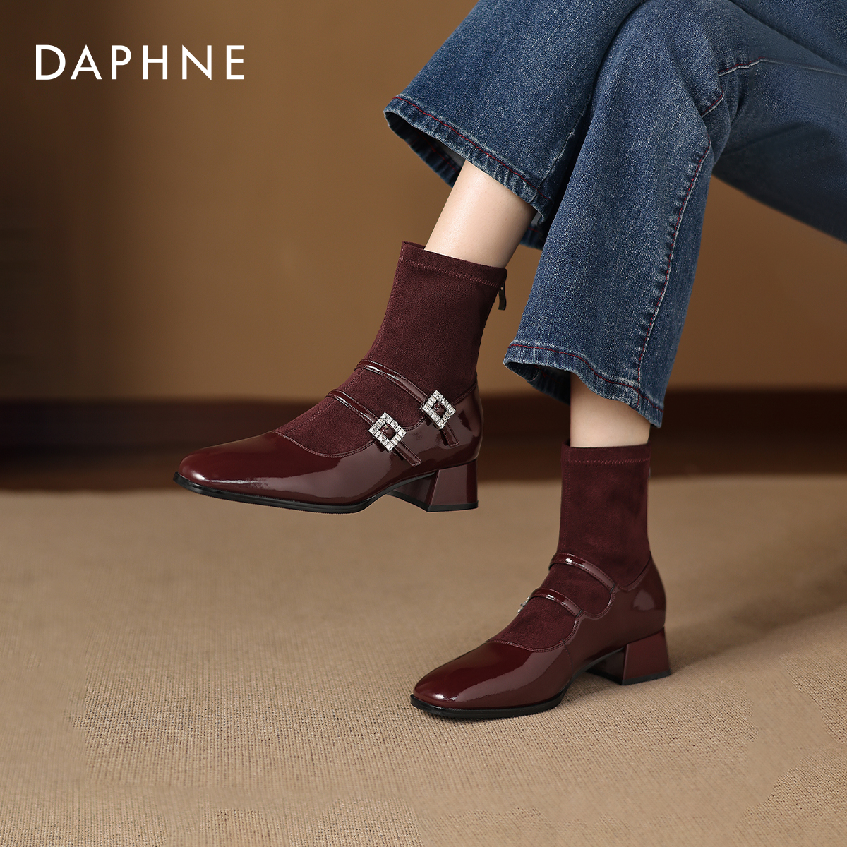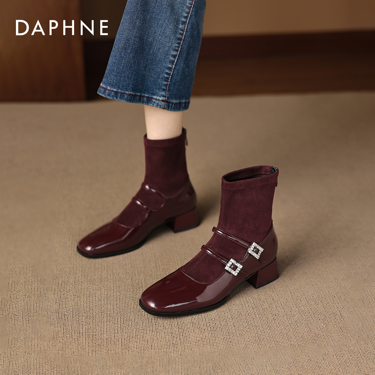 达芙妮红色短靴女款瘦瘦靴子冬2025新款高跟婚鞋玛丽珍袜靴马丁靴