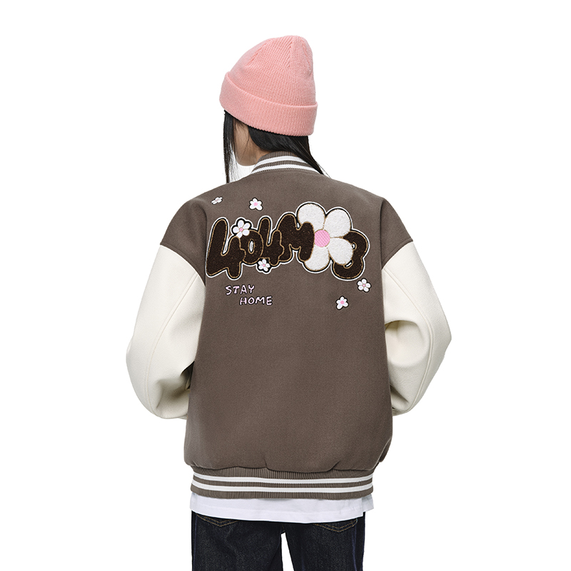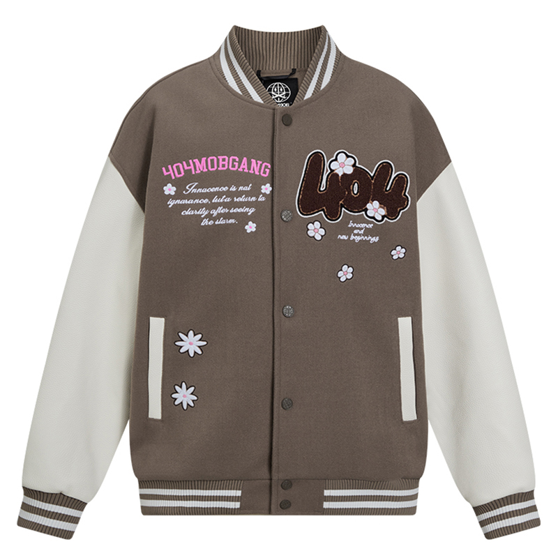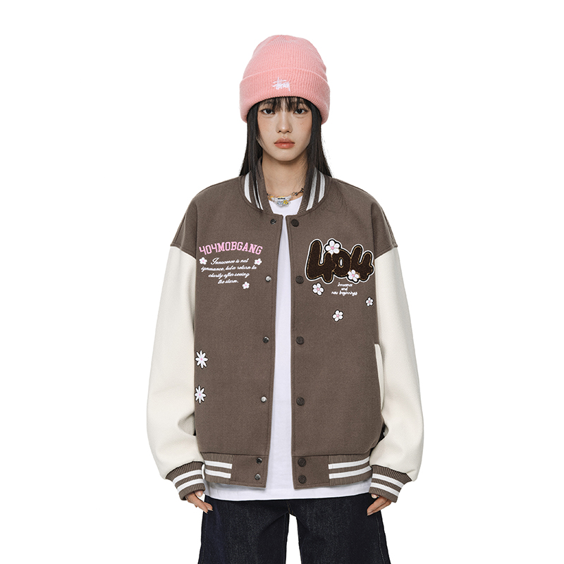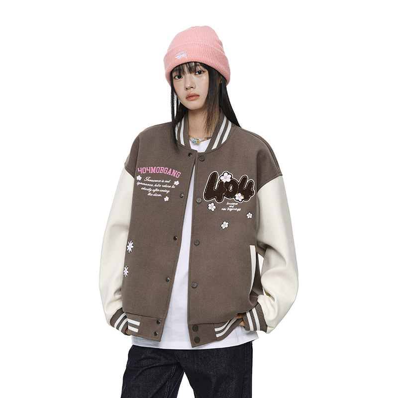 404MOB趣味花卉字母刺绣棒球服女潮牌宽松美式学院情侣夹克厚外套