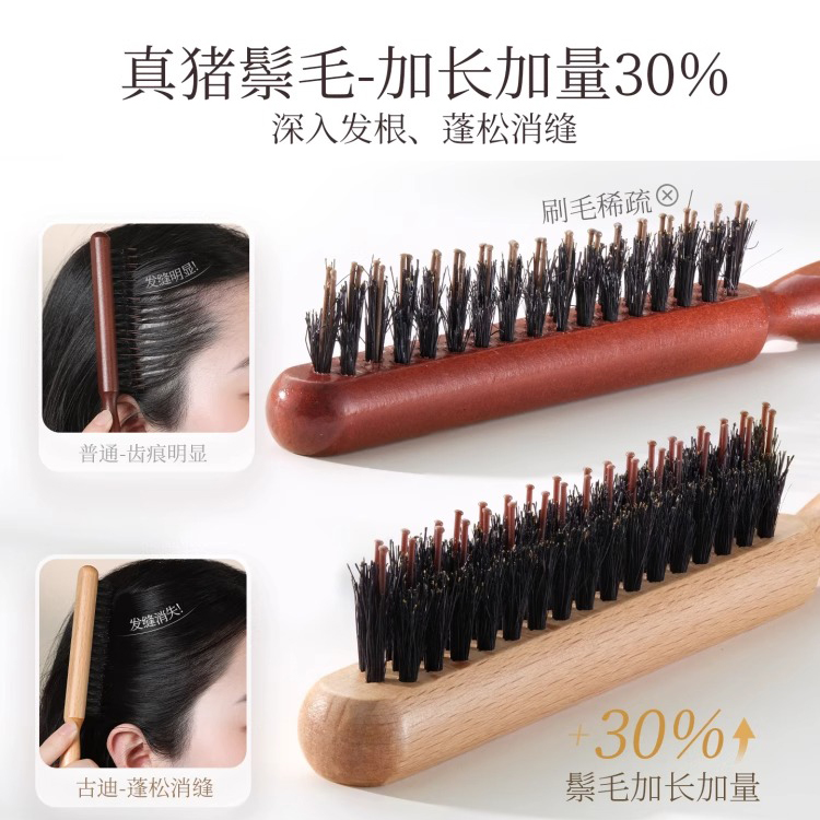 古迪猪鬃毛三排密齿梳蓬松高颅顶打毛顺发缝造型专用尖尾木梳子女