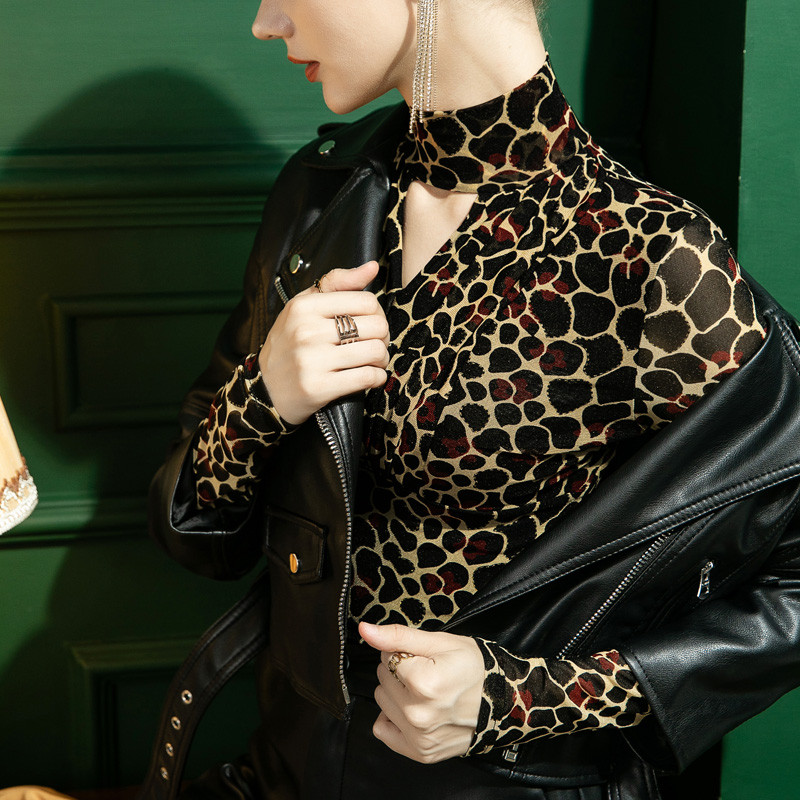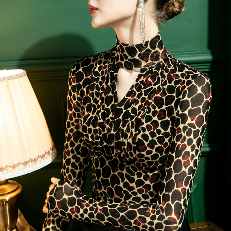 2025秋季新款高领网纱打底衫女镂空豹纹印花长袖春秋内搭上衣小衫