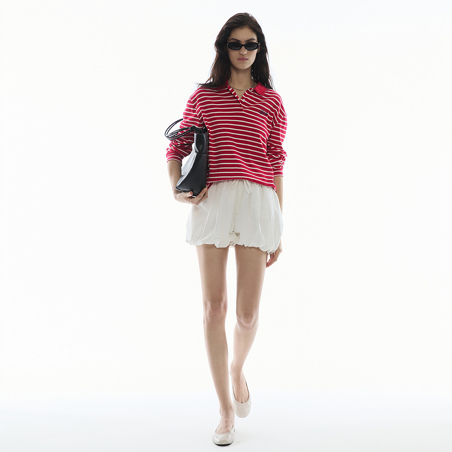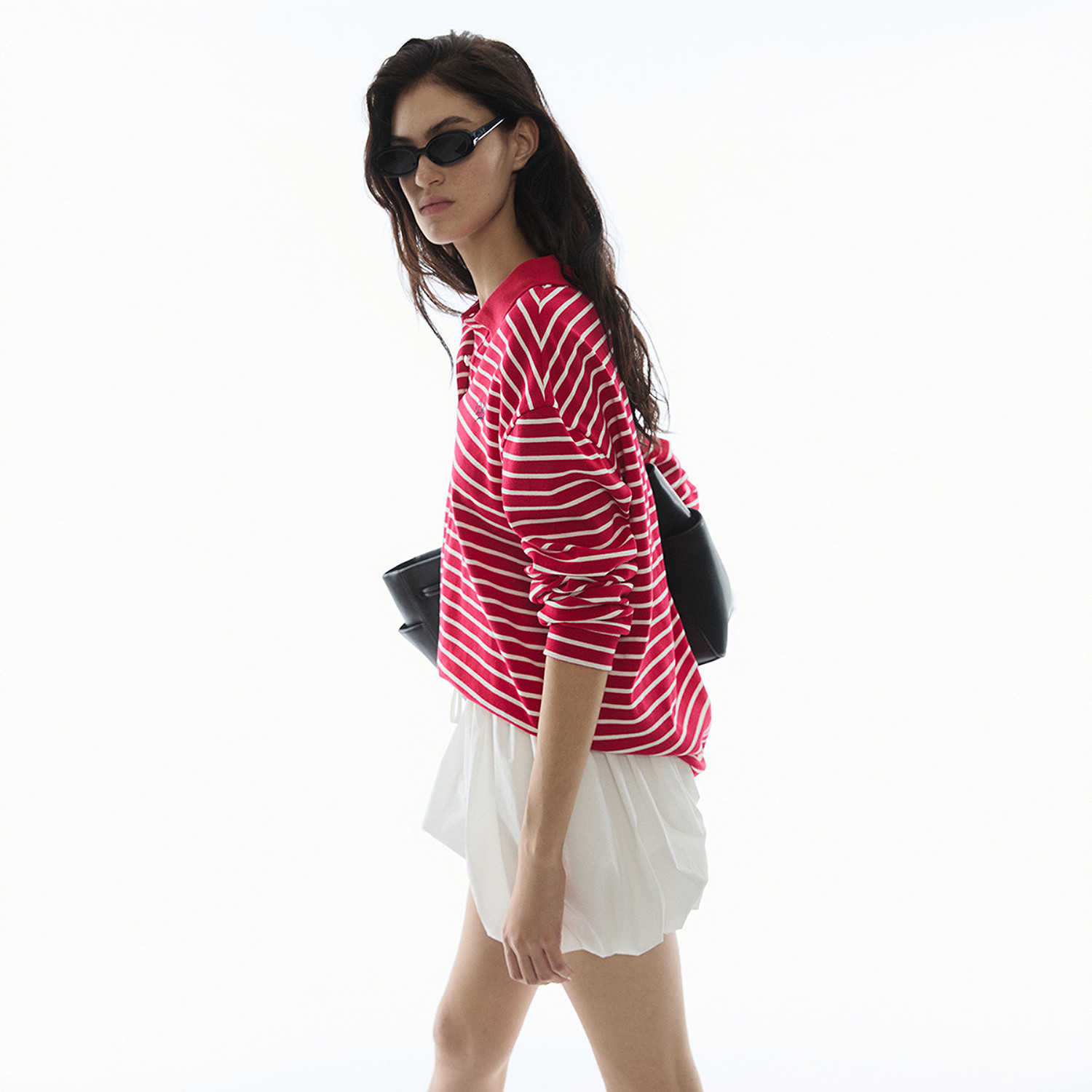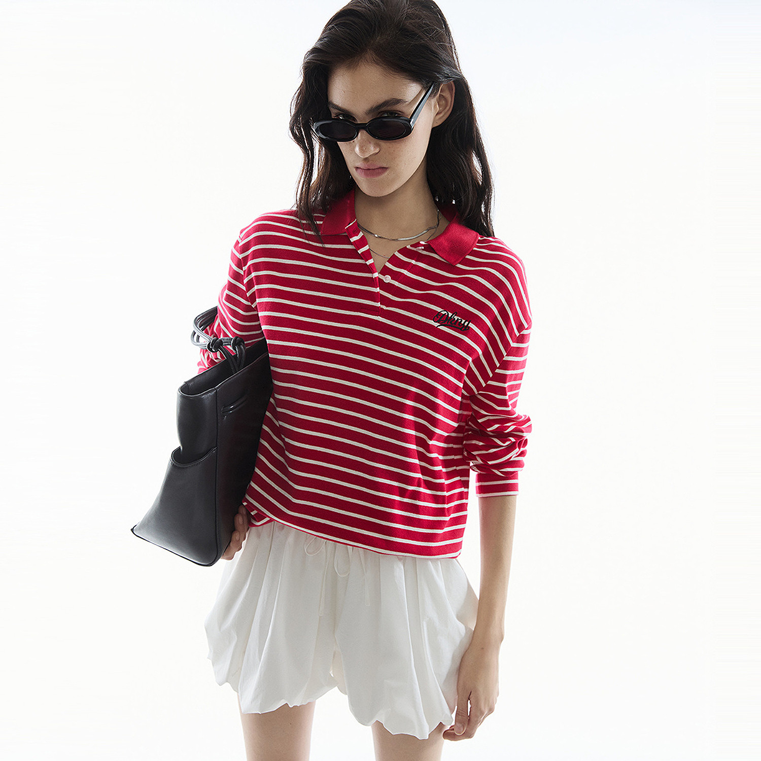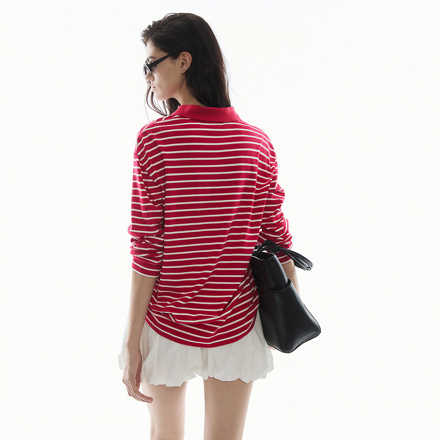 DKNY唐可娜儿26春季新款长袖polo衫女T恤红白色横条纹宽松上衣潮