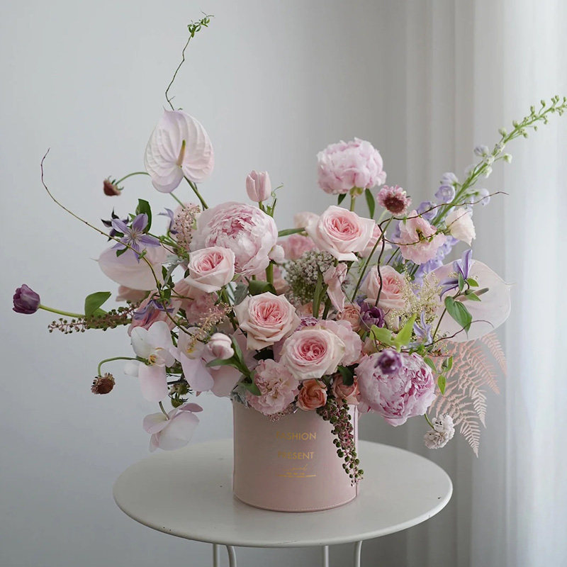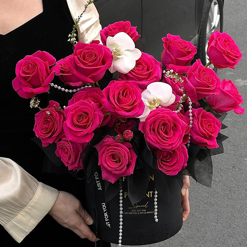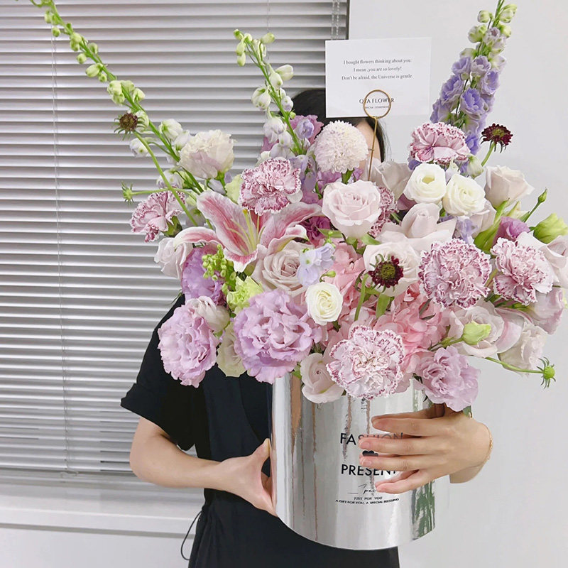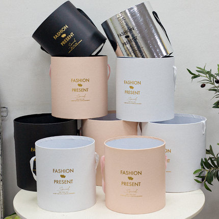 套三圆形抱抱桶花桶气球鲜花花束白色银色黑色包装盒花艺花店礼盒