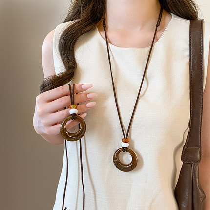 复古长款棕色圆环吊坠项链女毛衣链大气高档高级感秋冬衣服配饰品