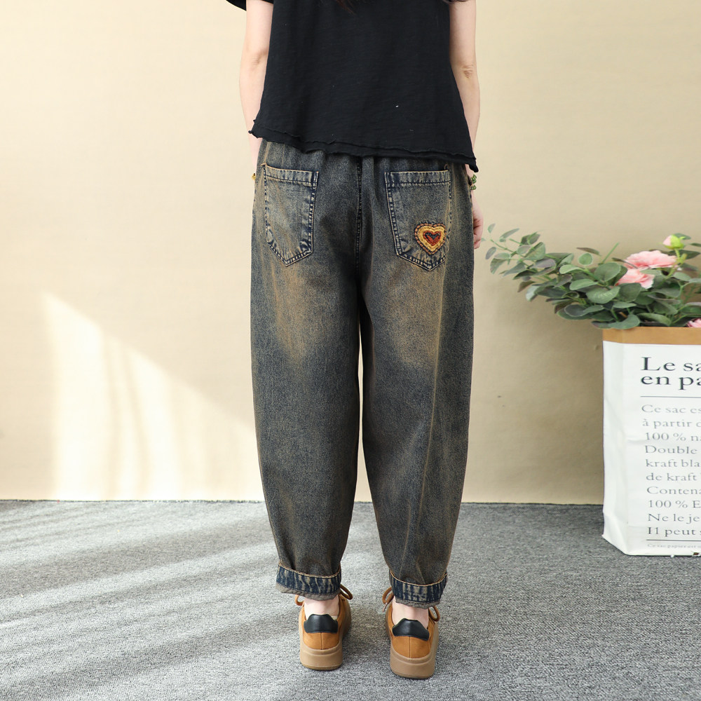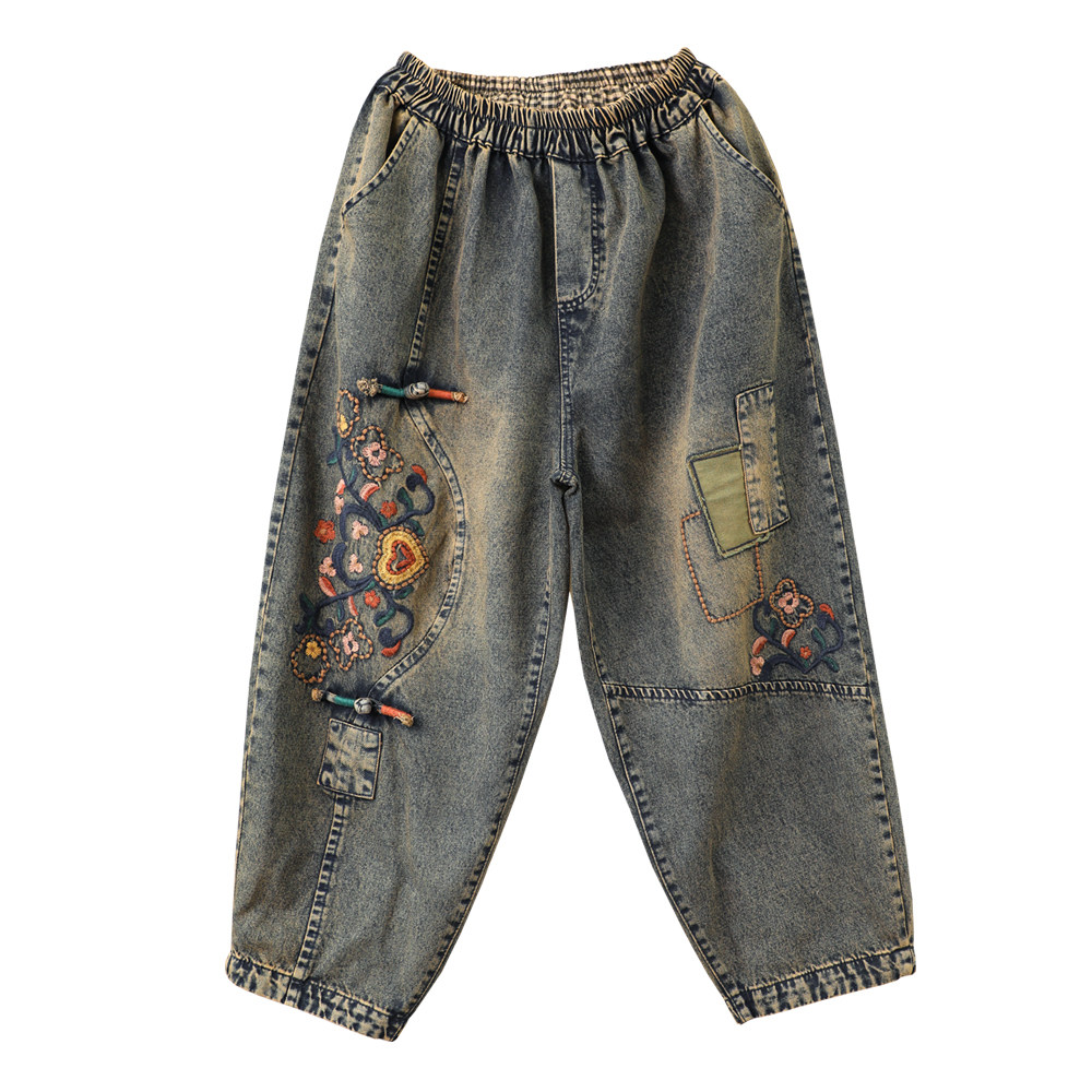 文艺复古民族风彩色盘扣刺绣牛仔裤女宽松大码绣花九分哈伦裤春季