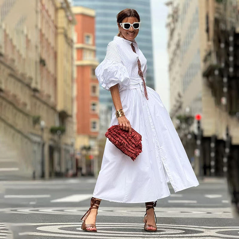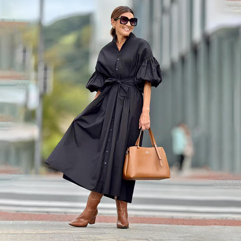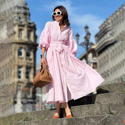 欧美时尚衬衫裙立领泡泡袖压褶系带连衣裙女一步裙高腰KDR546990p