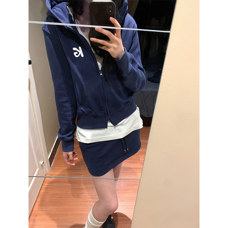 美式复古小个子运动休闲套装女春秋连帽卫衣外套a字半身裙两件套