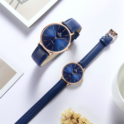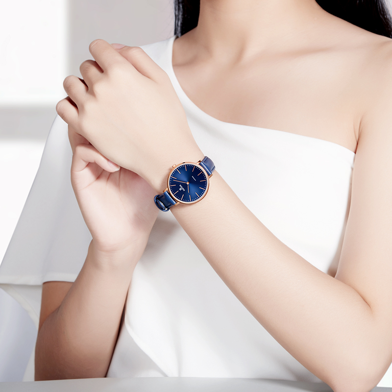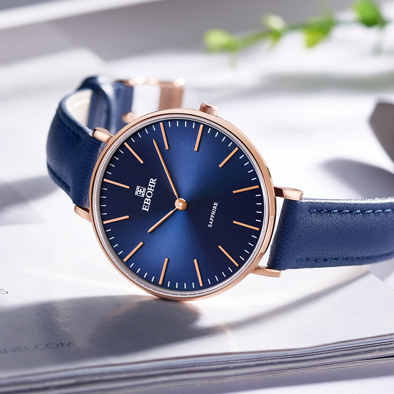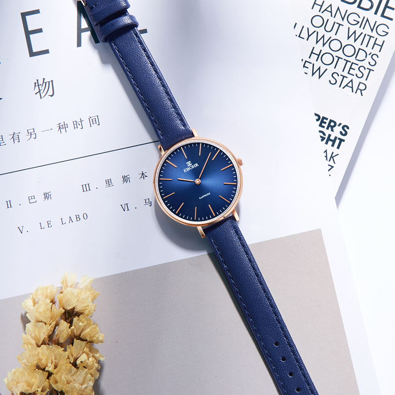依波表(EBOHR)牛皮表带蓝宝石表镜石英表女表超薄简约蓝色表3623
