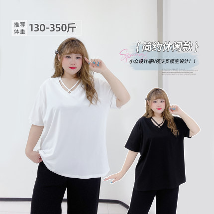 350斤胖莹特大码女装夏季设计感V领纯色简约百搭宽松镂空显瘦T恤