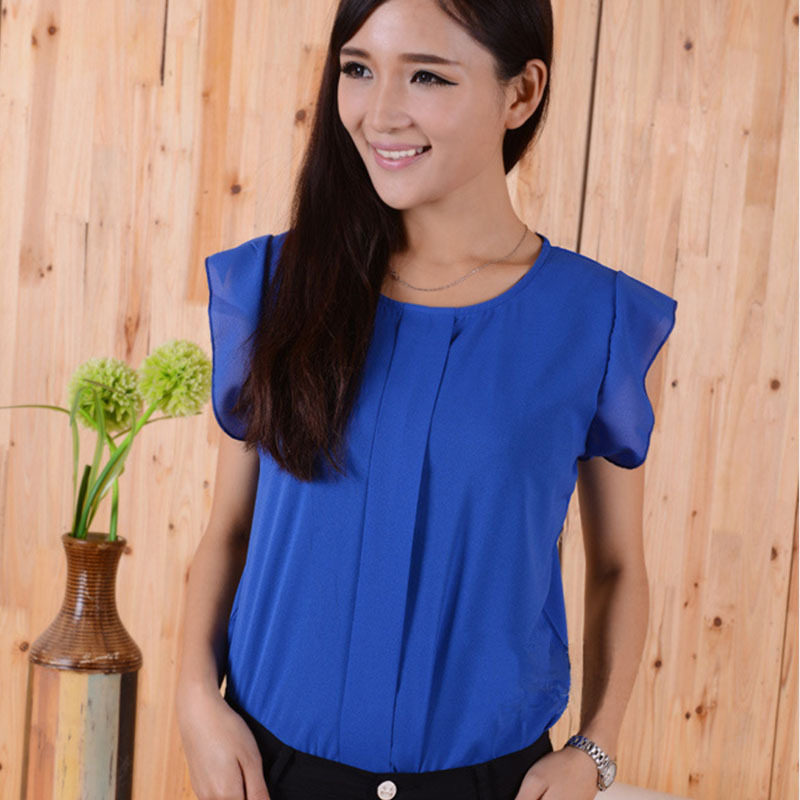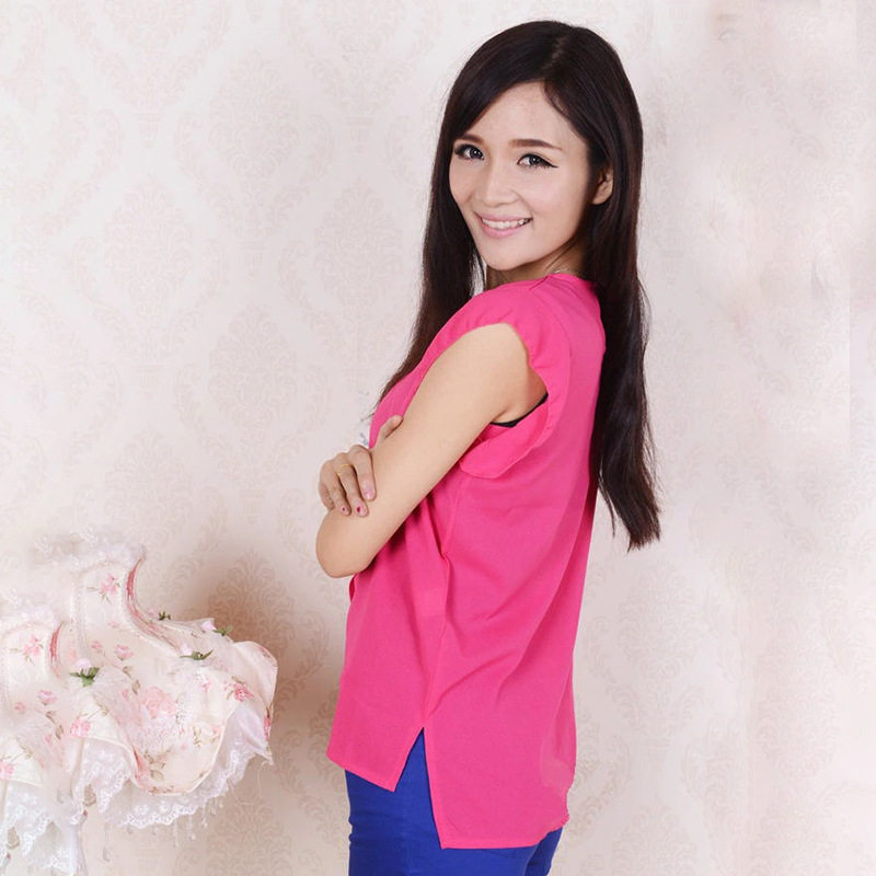 百搭圆领纯色短袖显瘦洋气雪纺衫