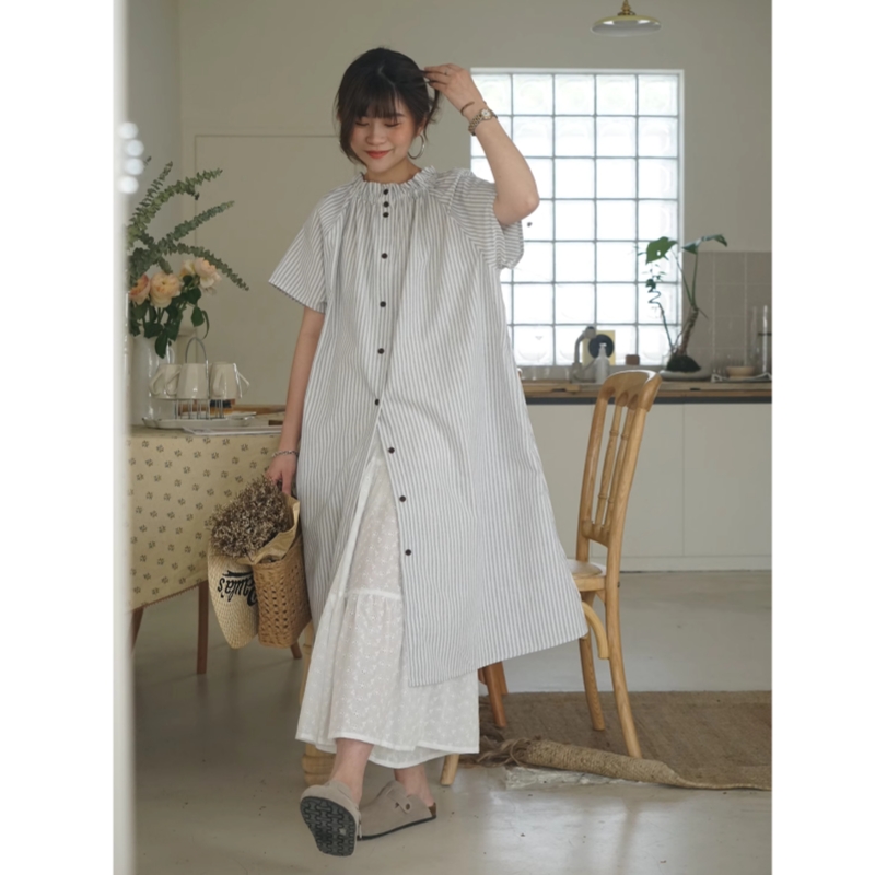 日系文艺荷叶领条纹连衣裙女夏季韩版宽松显瘦小个子休闲叠穿长裙