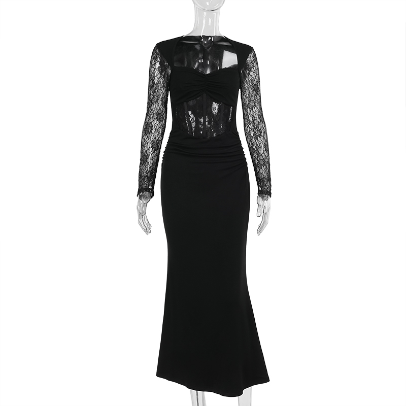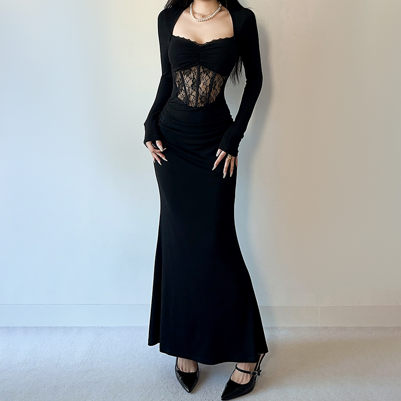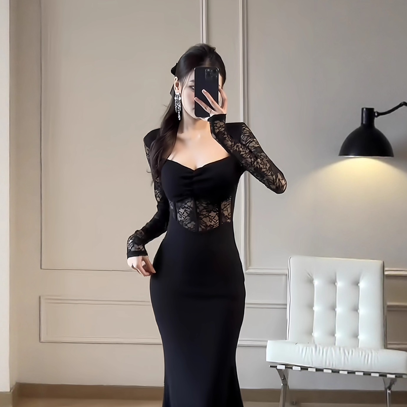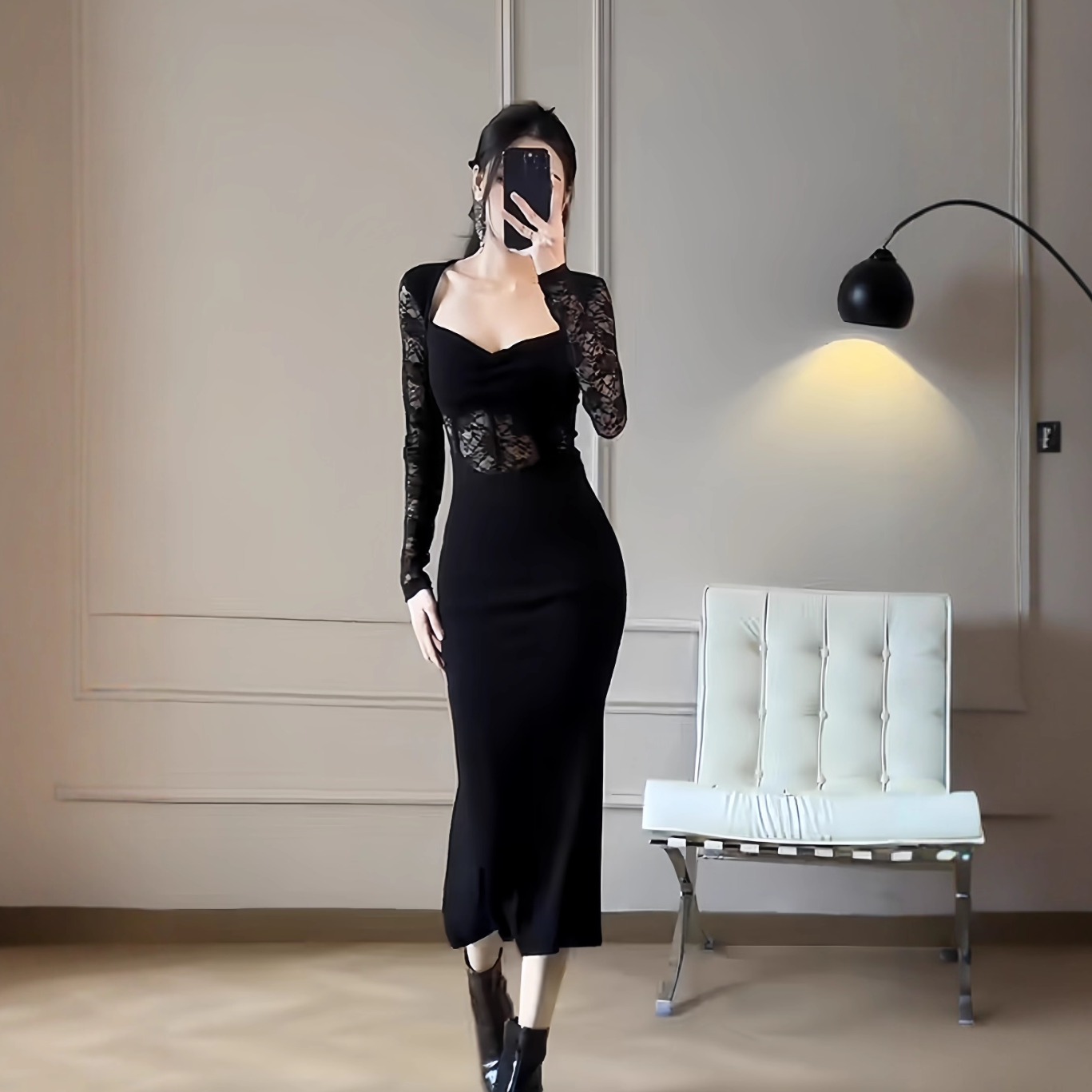 名媛御姐风气质方领连衣裙女蕾丝拼接长袖长裙高腰显瘦性感包臀裙