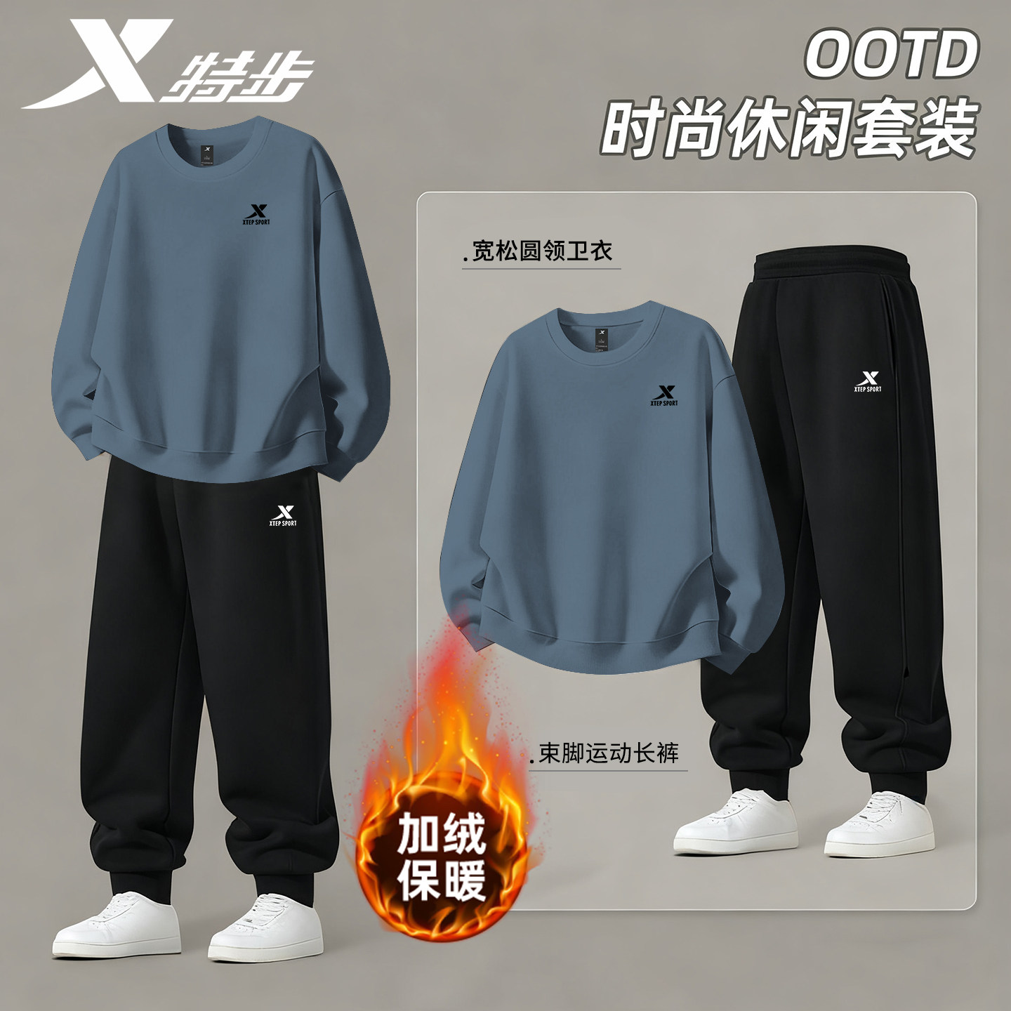 特步加绒运动套装男装2026冬季新款保暖白色卫衣长裤运动服两件套