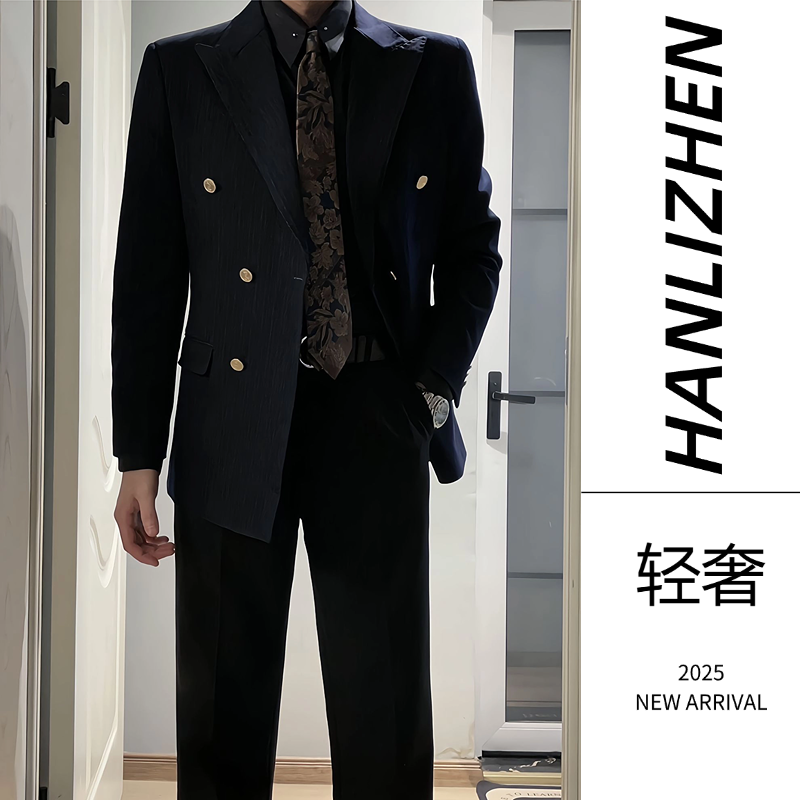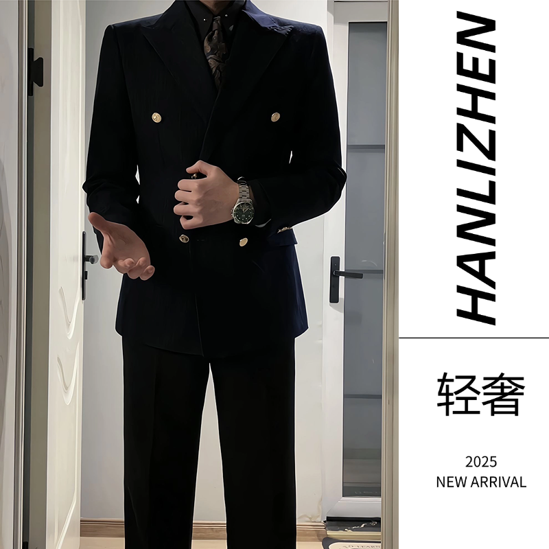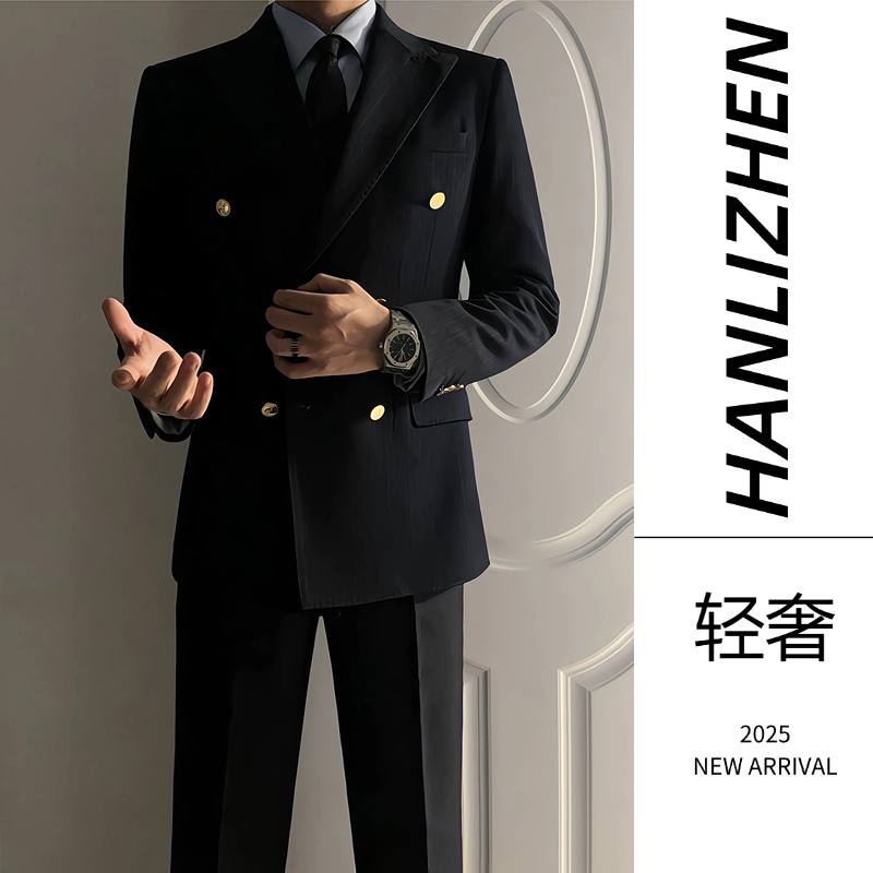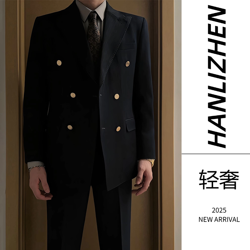 双排扣男士西装套装高级感英伦风修身布雷泽金属纽扣新郎结婚西服