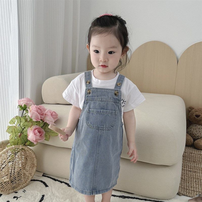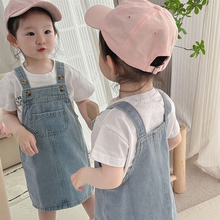韩版女童夏季背带牛仔裙套装2024新款女宝宝儿童夏装洋气休闲裙子