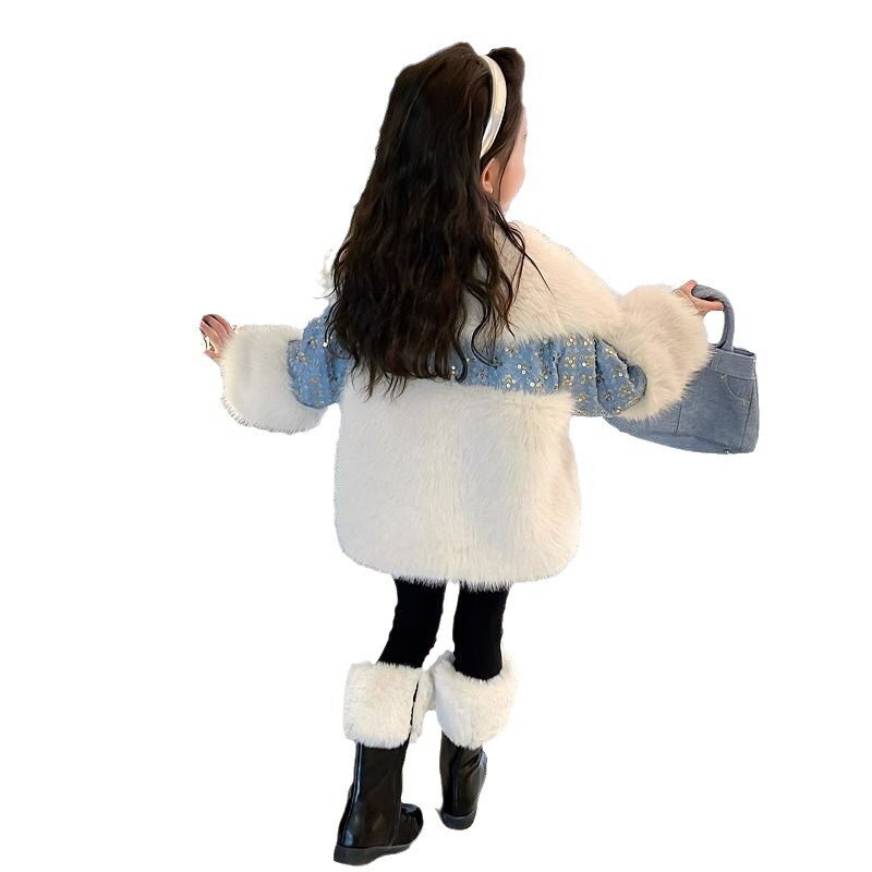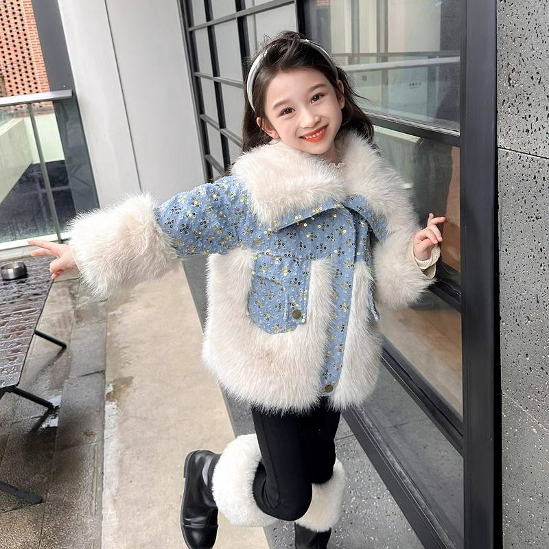 女童仿皮草加绒加厚牛仔外套秋冬款2024新款儿童棉服宝宝冬装时尚