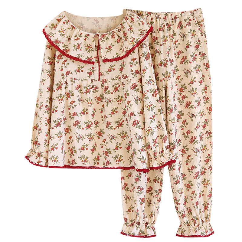甜美娃娃领女士睡衣春秋夏季长袖纯棉纱布甜美薄款田园家居服套装