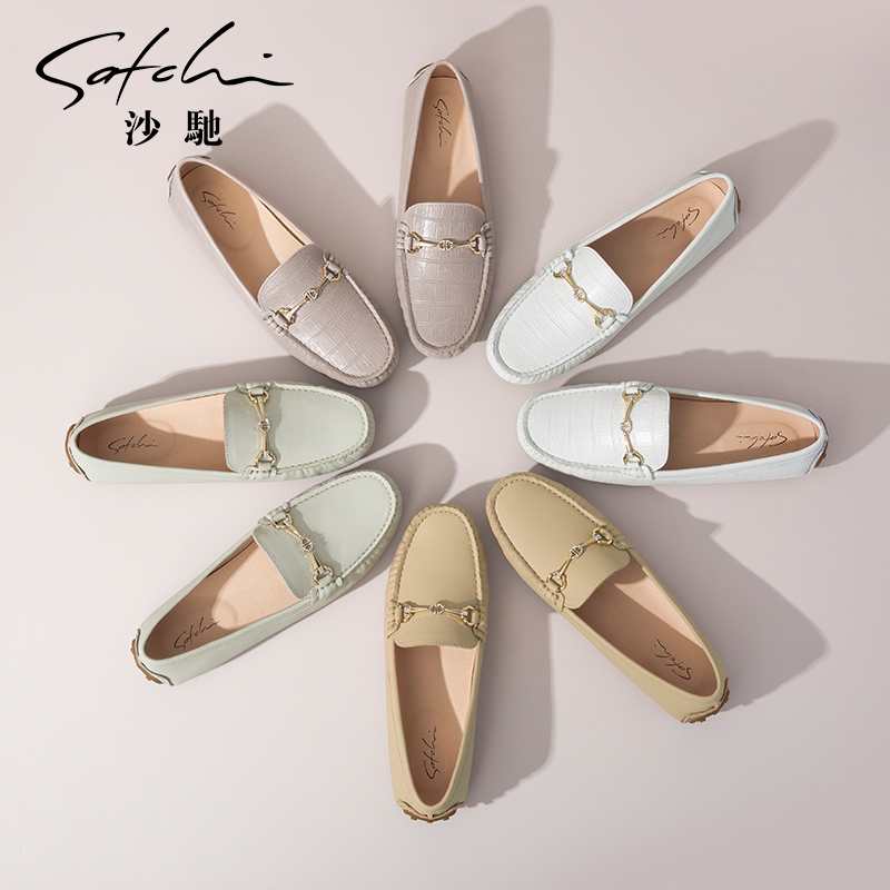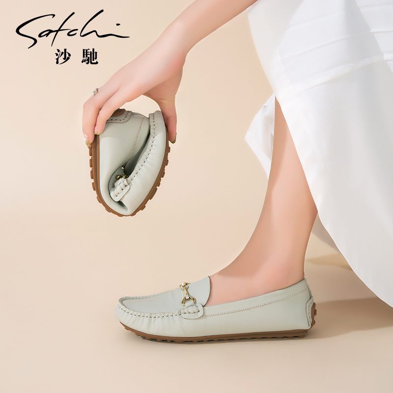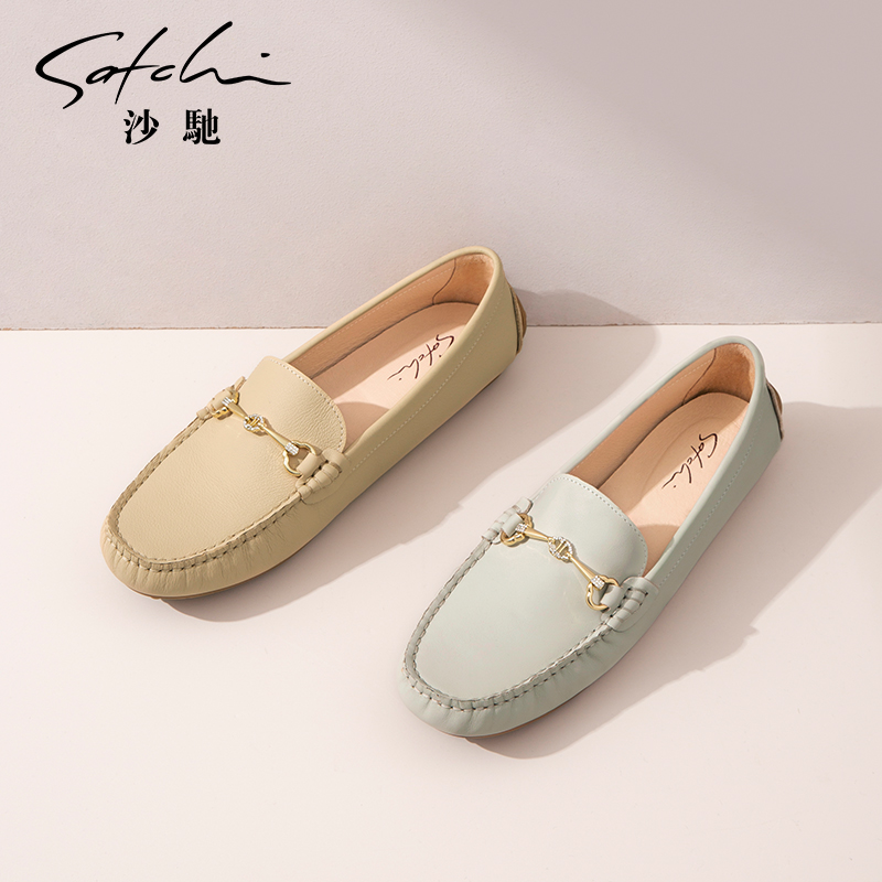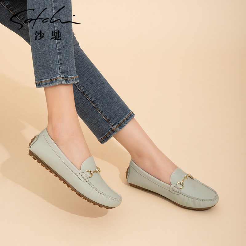 沙驰女鞋舒适休闲平底单鞋春夏季新款真皮豆豆鞋软底蛋卷鞋女