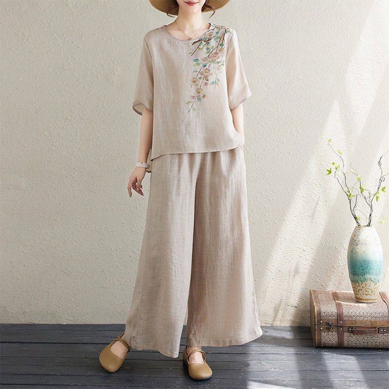 棉麻短袖t恤套装女2025夏季新款宽松大码纯色印花九分裤两件套