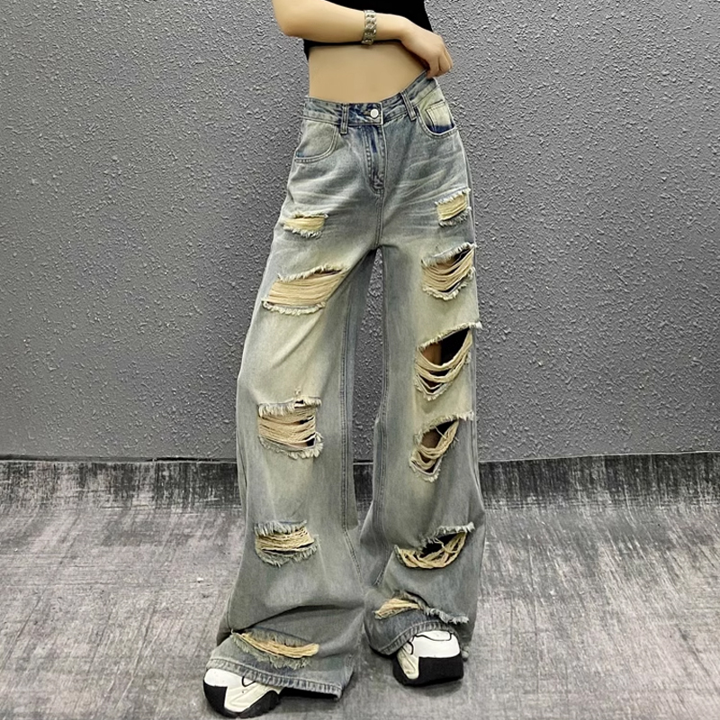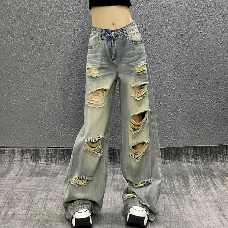 个性破洞做旧休闲牛仔裤女夏新款高腰宽松显瘦百搭直筒阔腿拖地裤