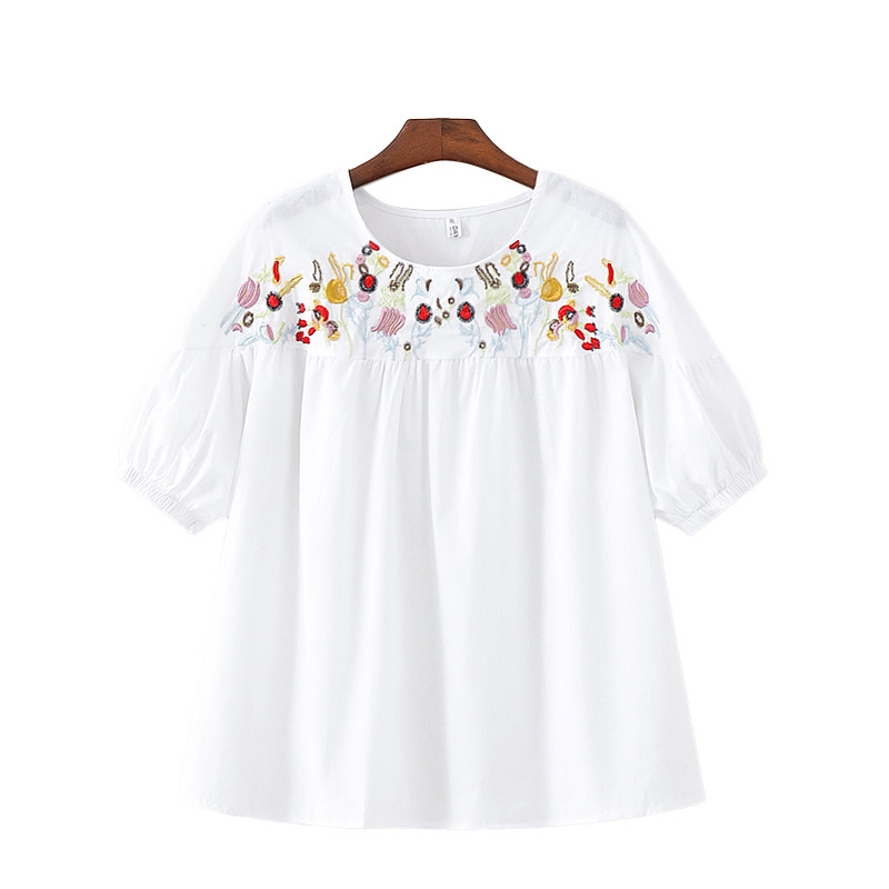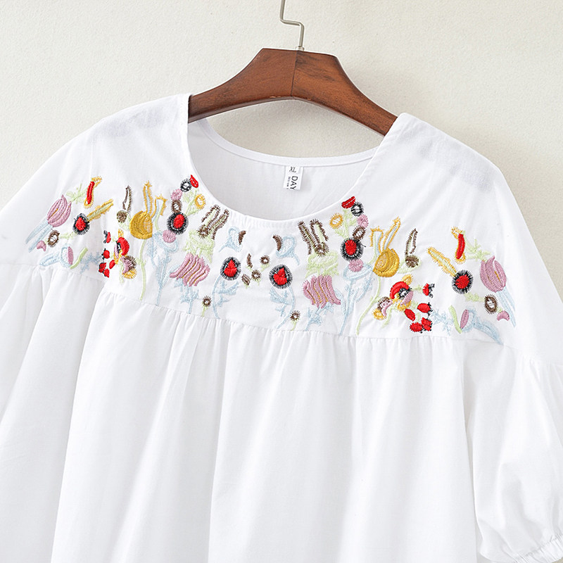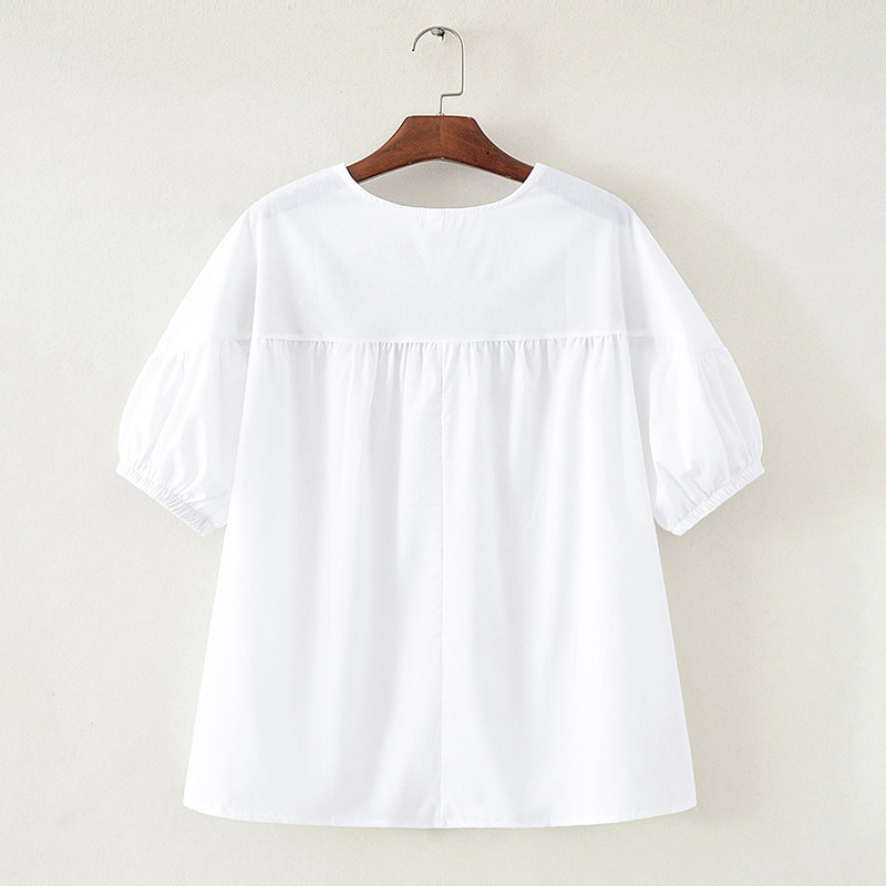 棉麻拼接褶皱刺绣T恤衫大码圆领短袖娃娃衫胖mm亚麻套头上衣宽松