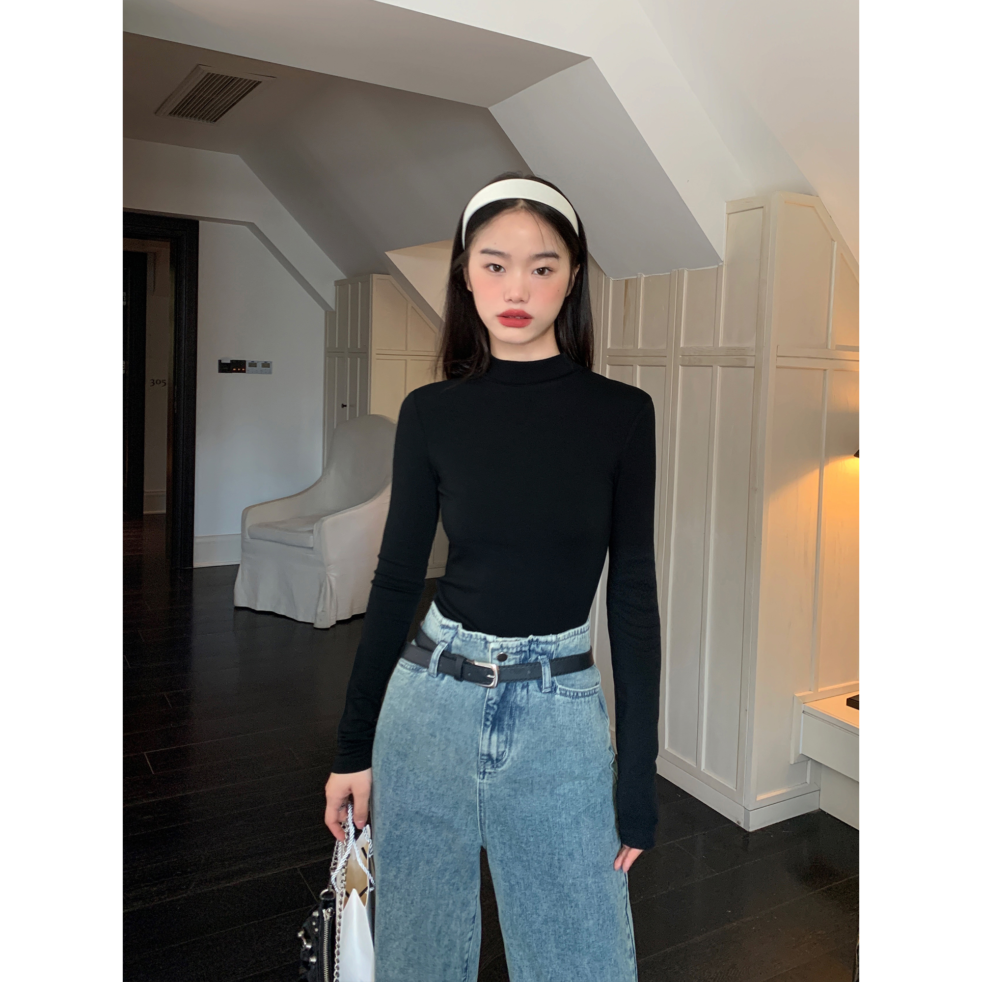 pusumede 黑色半高领打底针织衫女秋冬韩版显瘦气质长袖t恤上衣