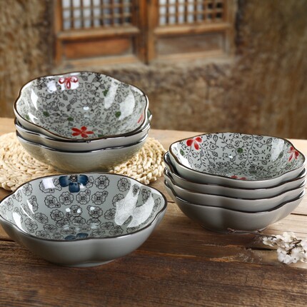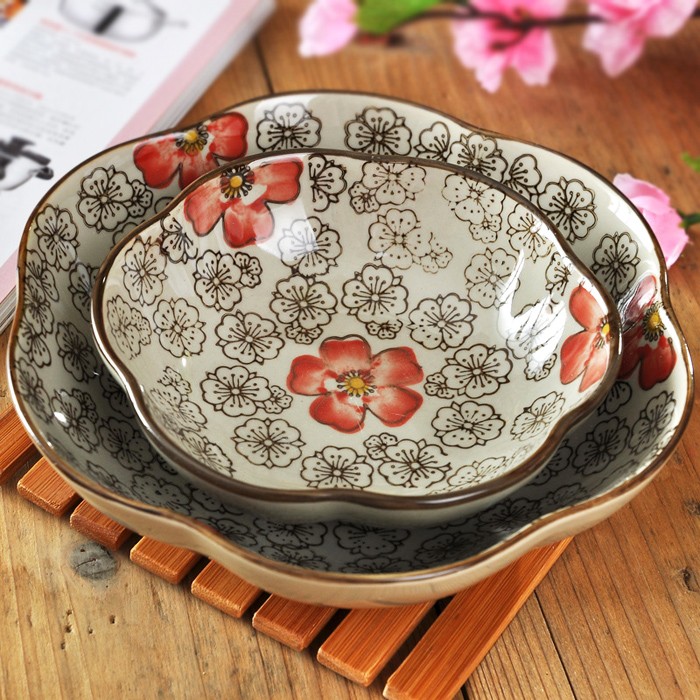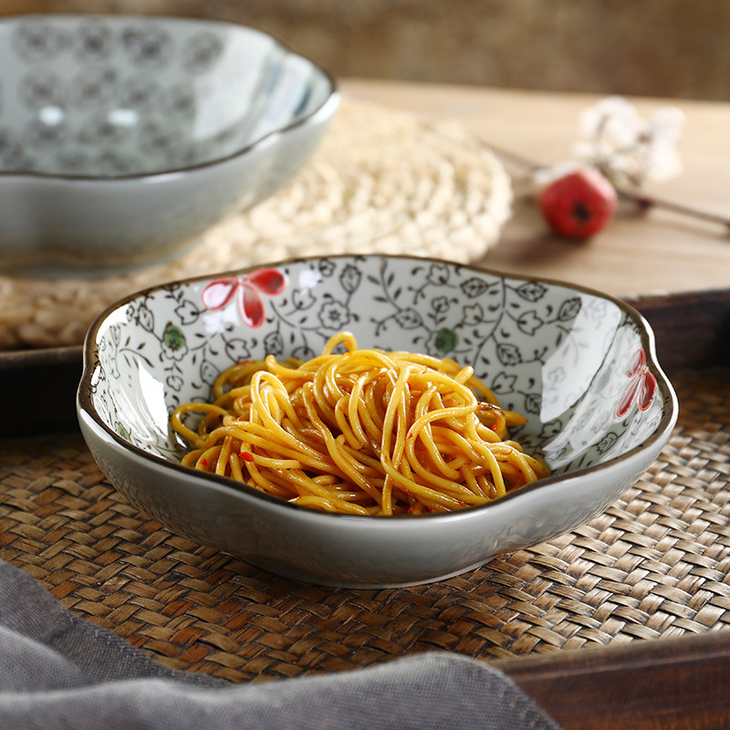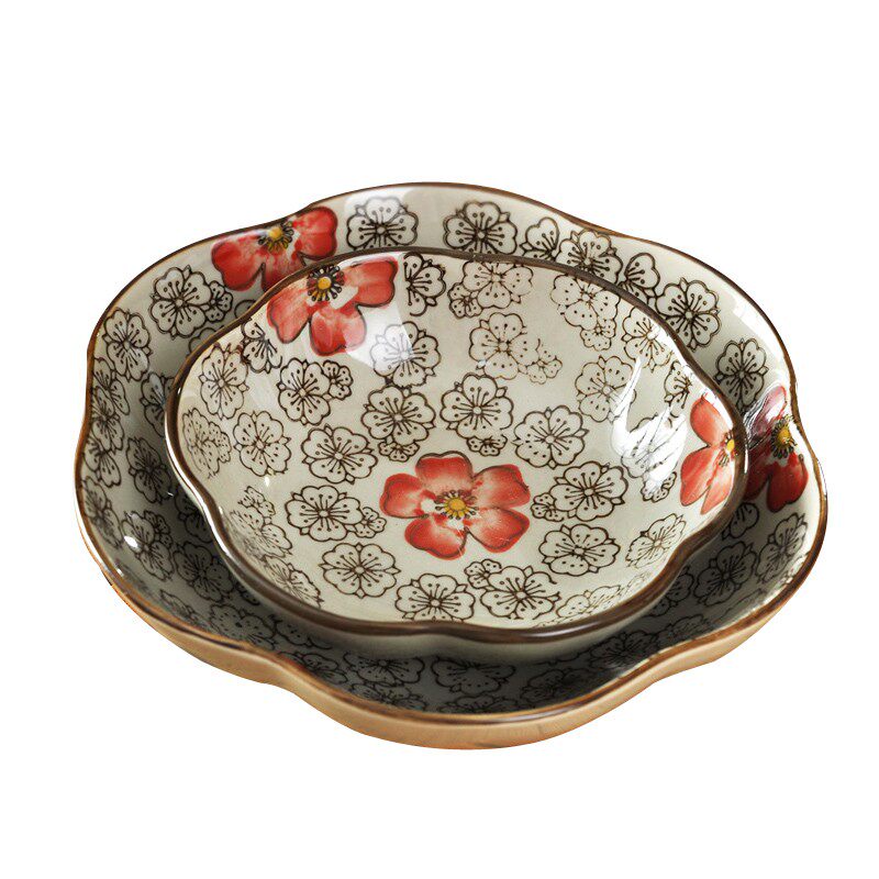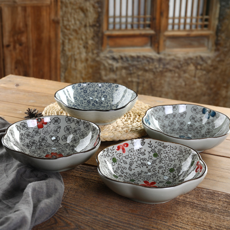 日式复古陶瓷梅花形盘子家用菜盘子深盘水果盘釉下彩加厚可微波炉