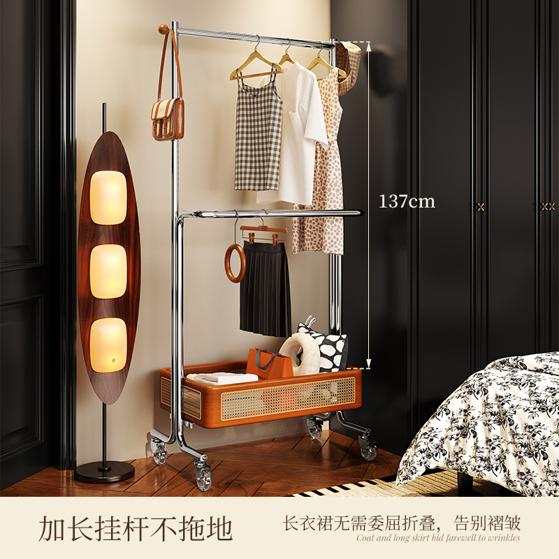复古挂衣架双层是实木落地式卧室移动衣帽架转角脏衣篓收纳置物架