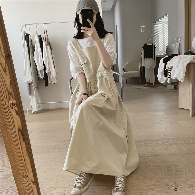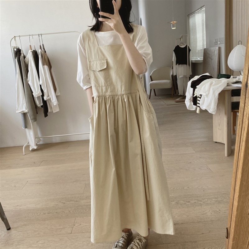 棉质背带裙女士春夏季新款宽松显瘦复古高腰无袖文艺中长裙连衣裙