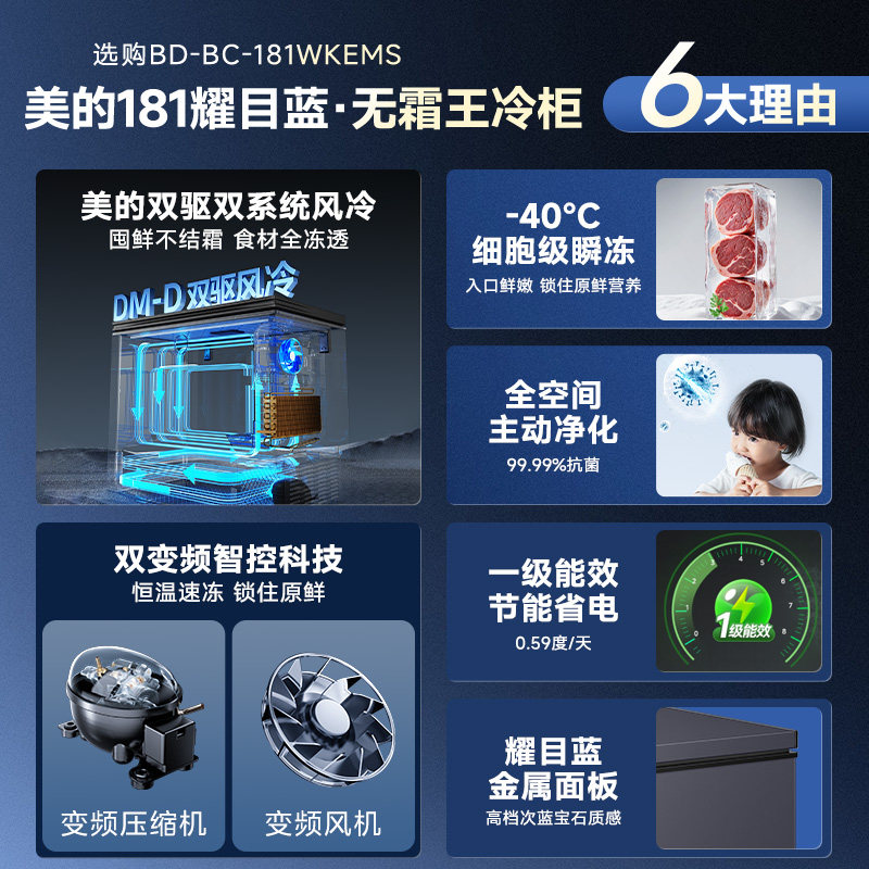 美的无霜王181小冰柜风冷家用双变频冷柜小型冷冻冷藏两用冰箱