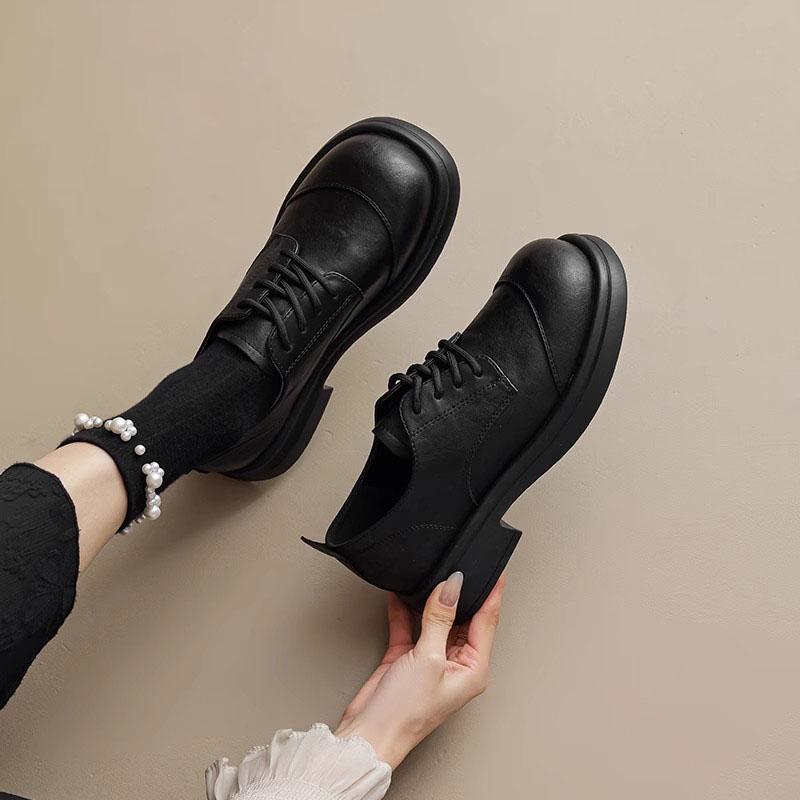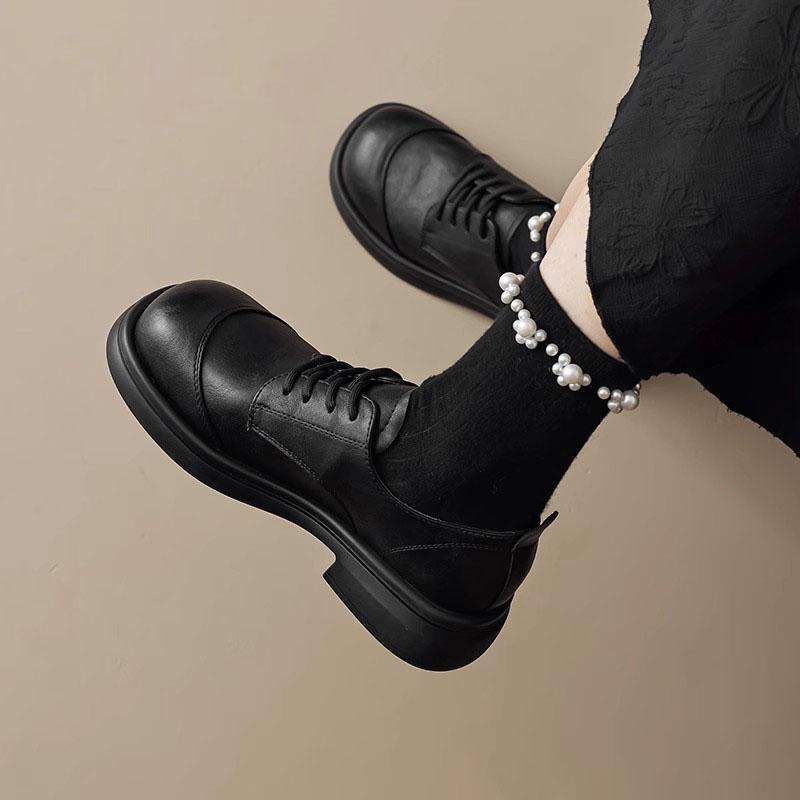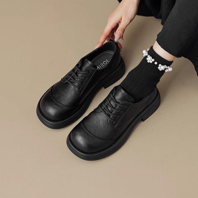 英伦风全真皮小皮鞋女系带单鞋2025新款春季黑色百搭厚底乐福鞋子