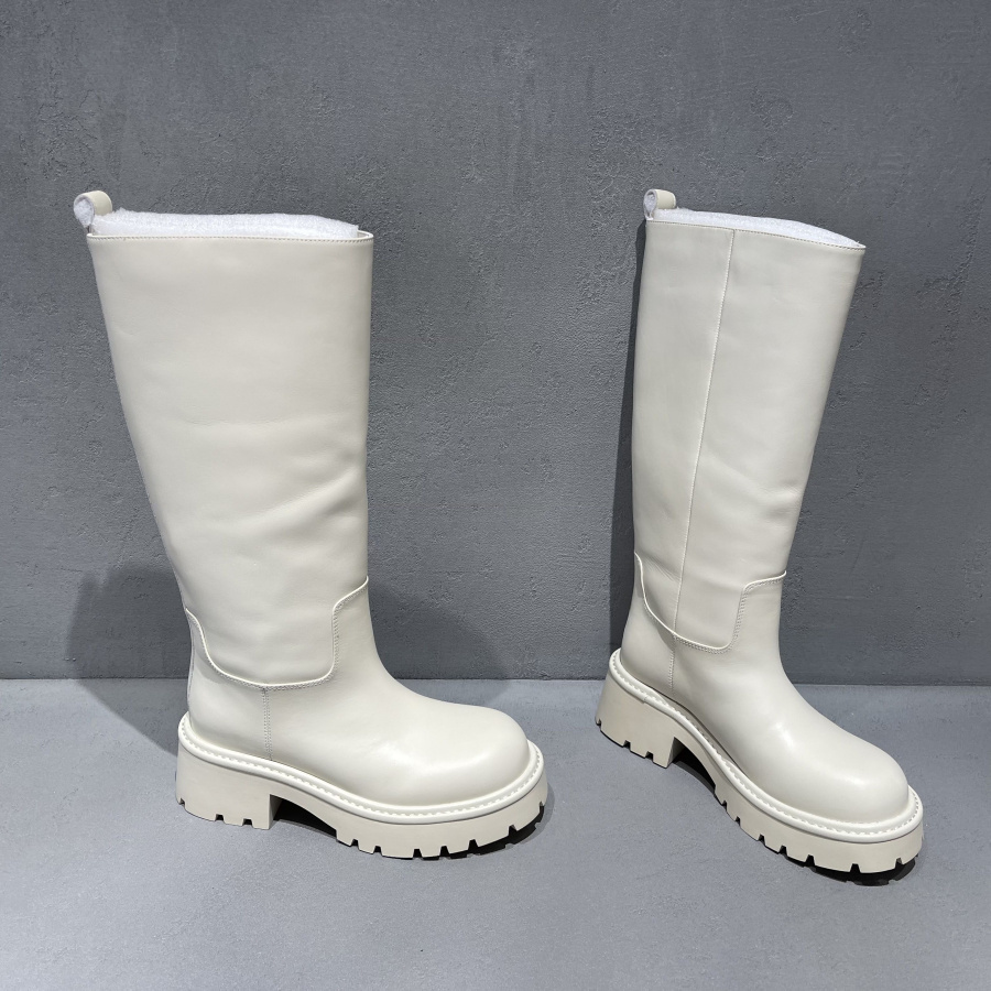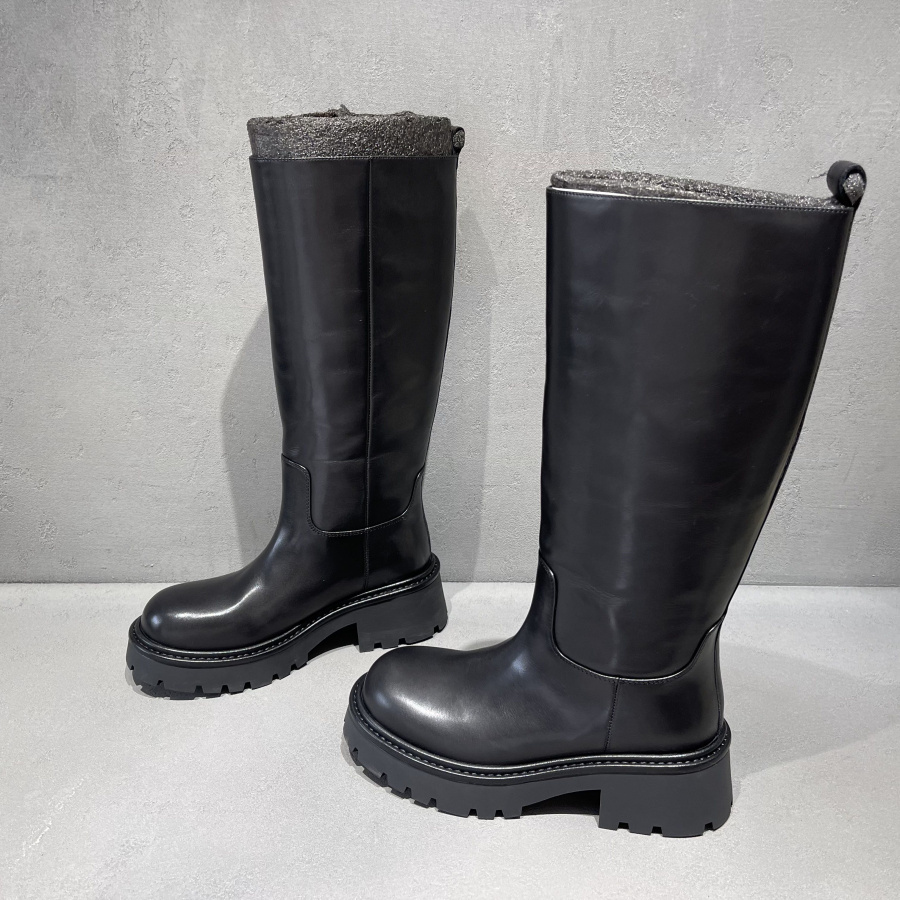 小牛皮粗跟圆头高筒长靴烟筒靴女