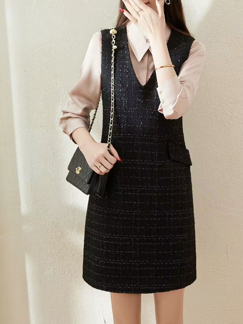 2024年秋冬季新品毛呢无袖口袋连衣裙女小香风后背拉链背心马甲裙