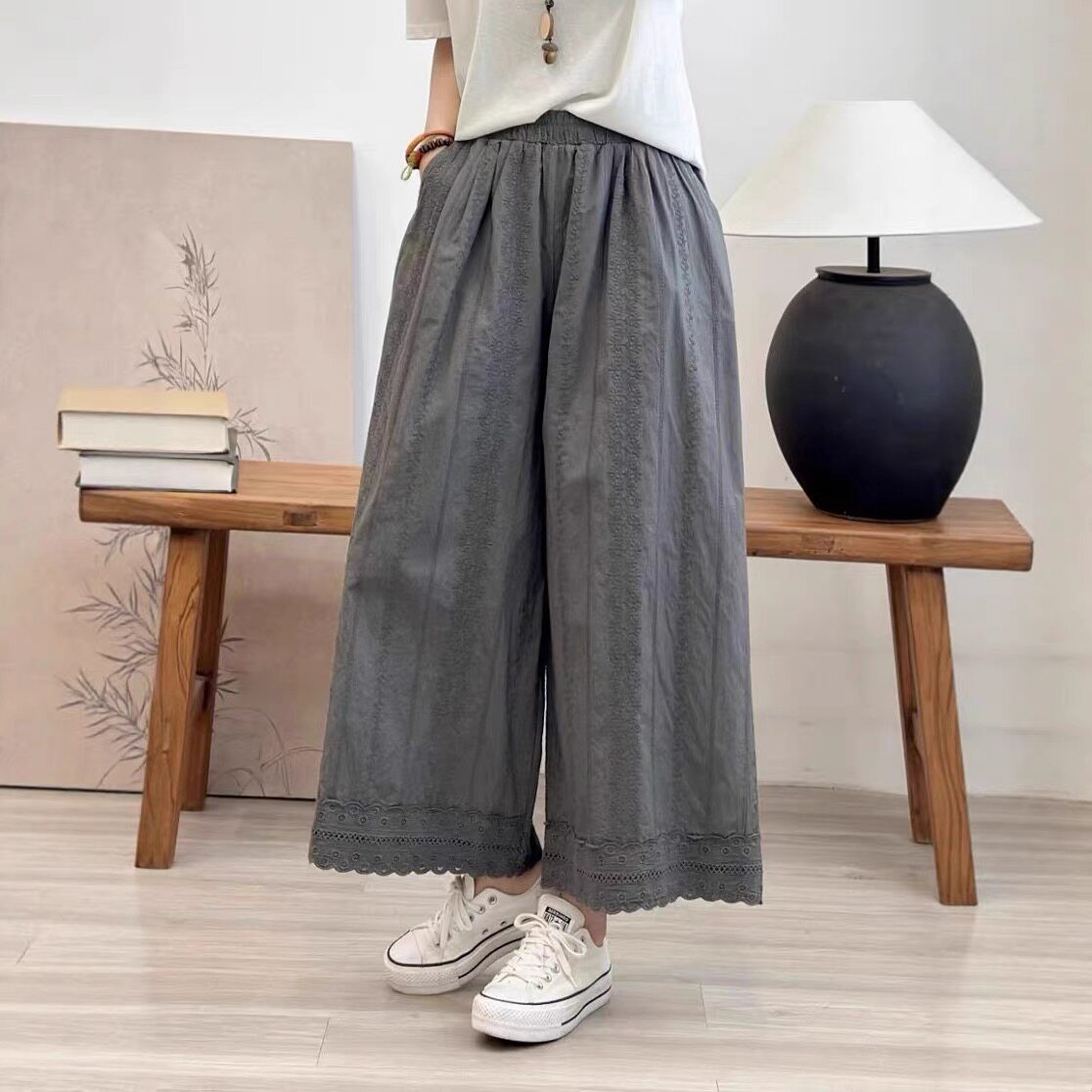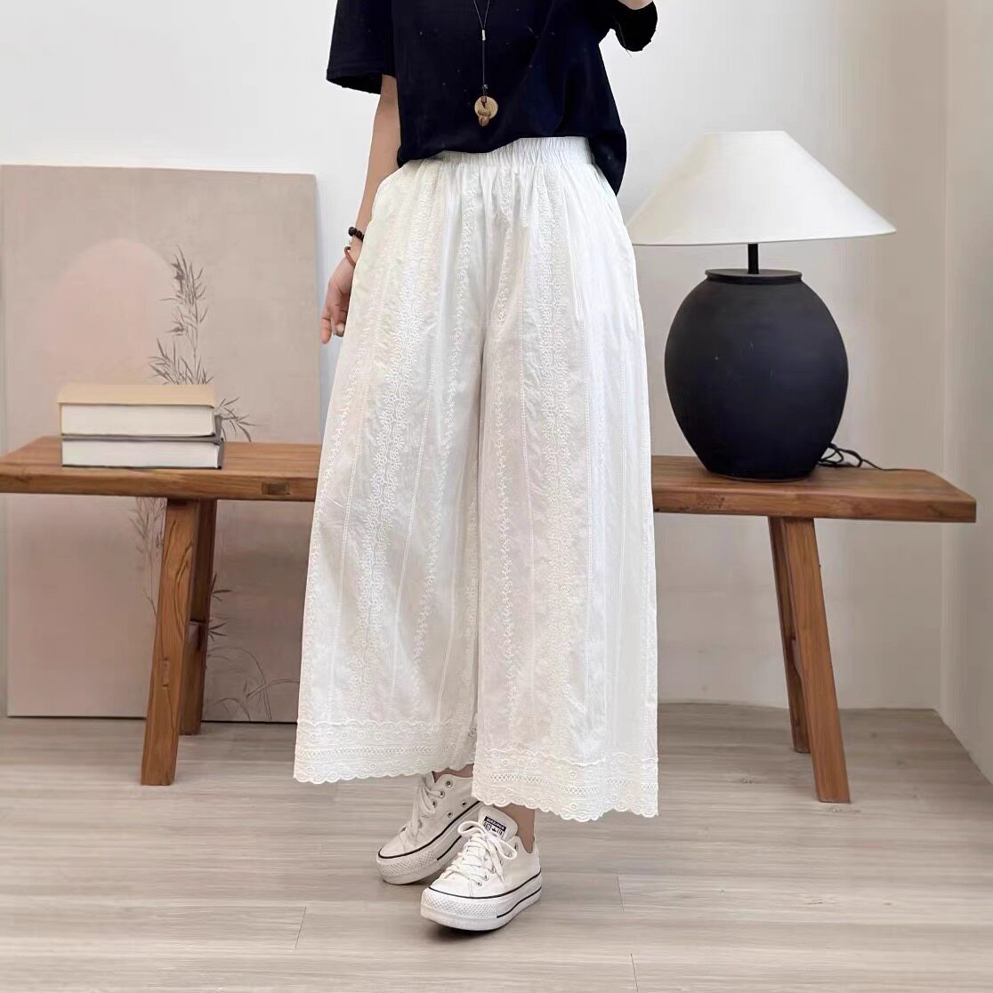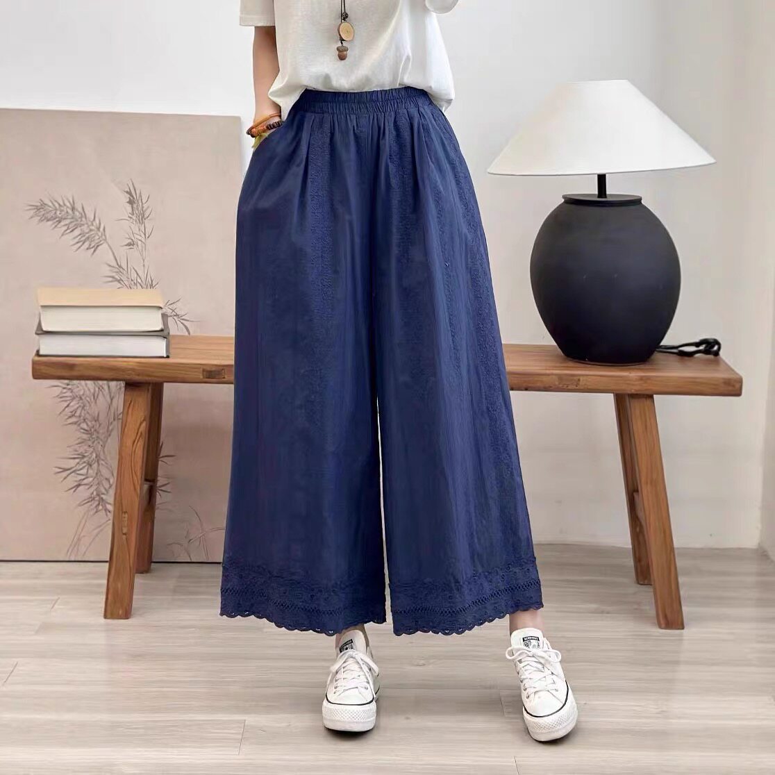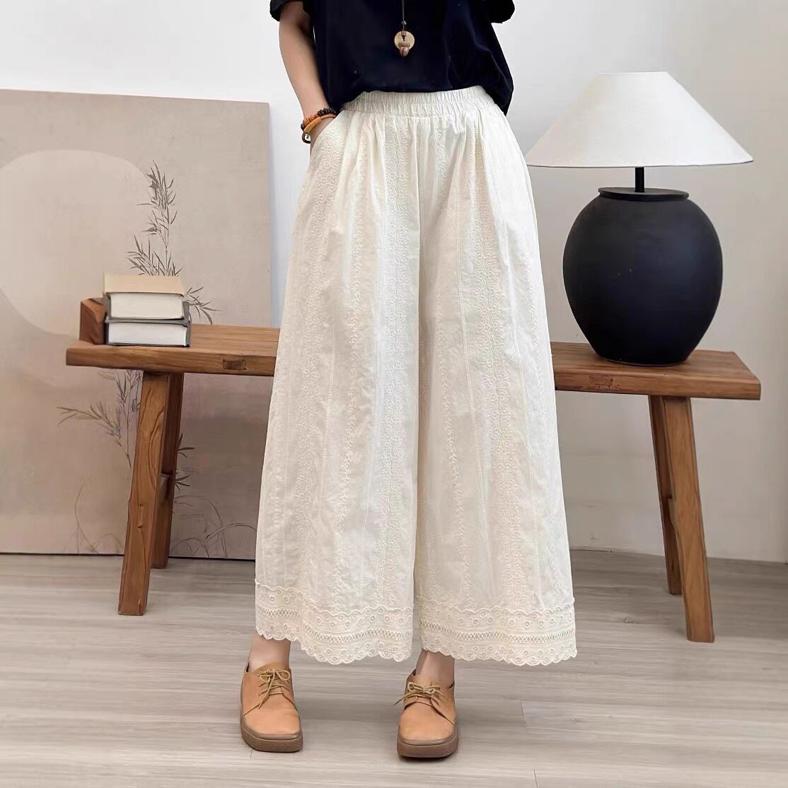 25夏秋新森女系棉布刺绣松紧腰宽松阔腿裤8,9分裤子透气休闲裤女