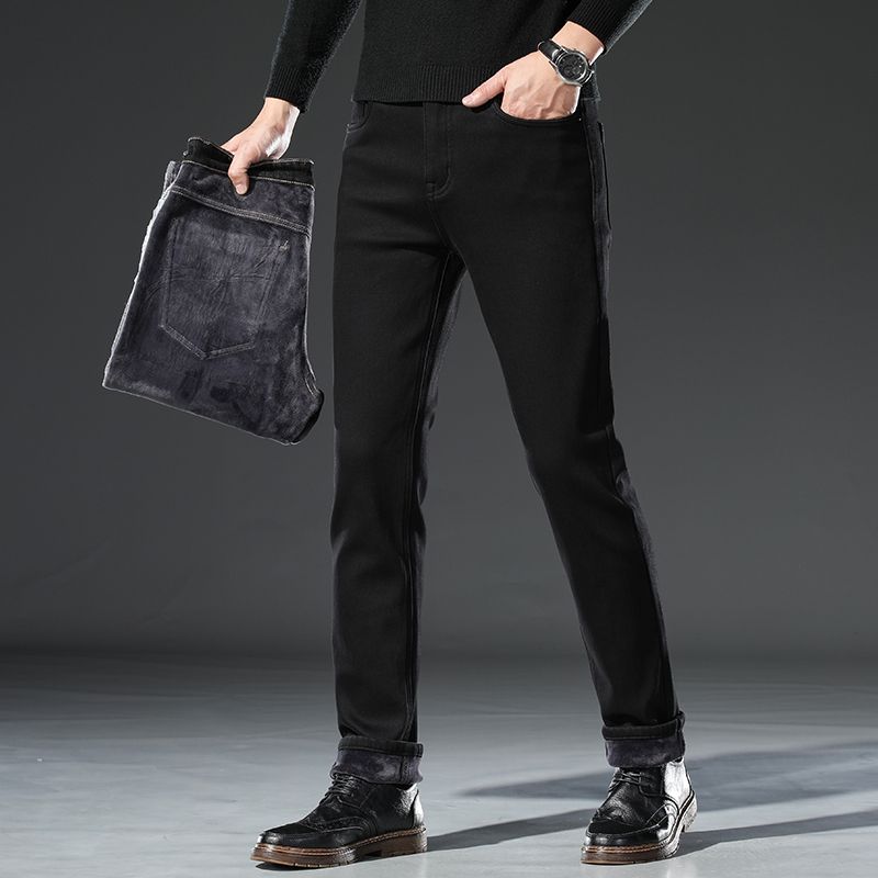 冬季加绒黑色牛仔裤男直筒