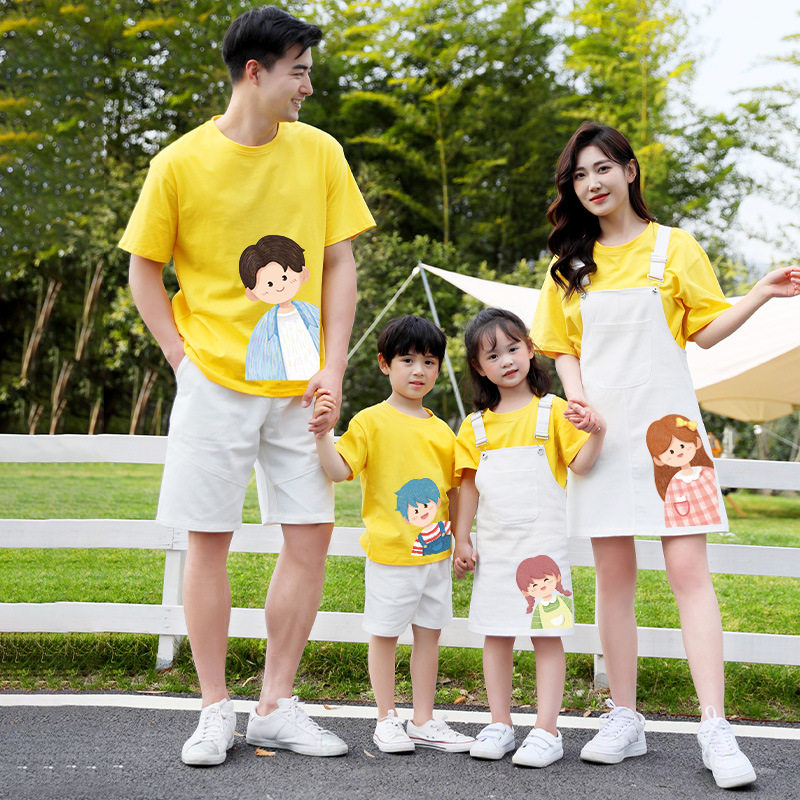 亲子装夏季套装一家四口母女装白色牛仔背带裙短裤套装短裙出游装