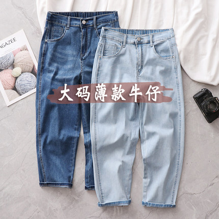 夏季薄款大码牛仔裤女九分裤胖妹妹裤宽松妈妈裤子高腰七分哈伦裤