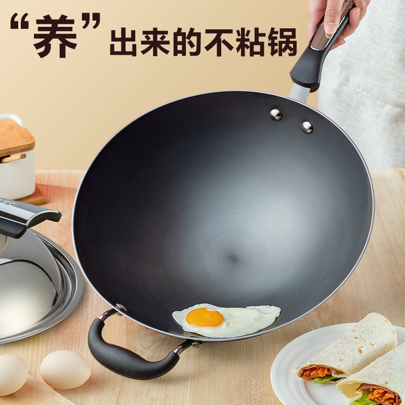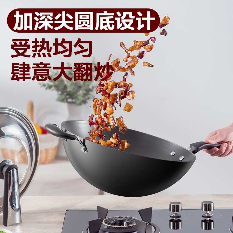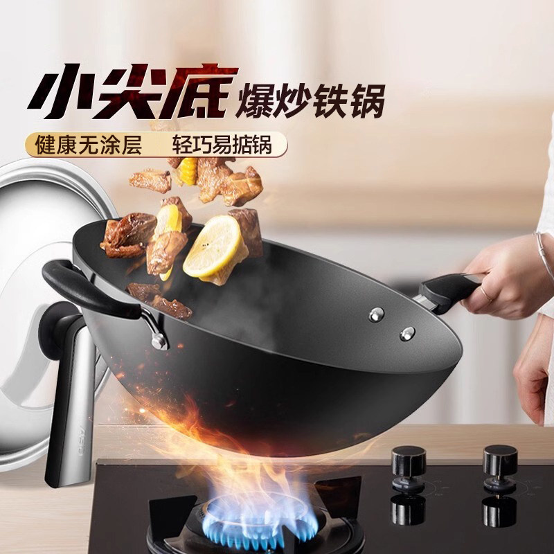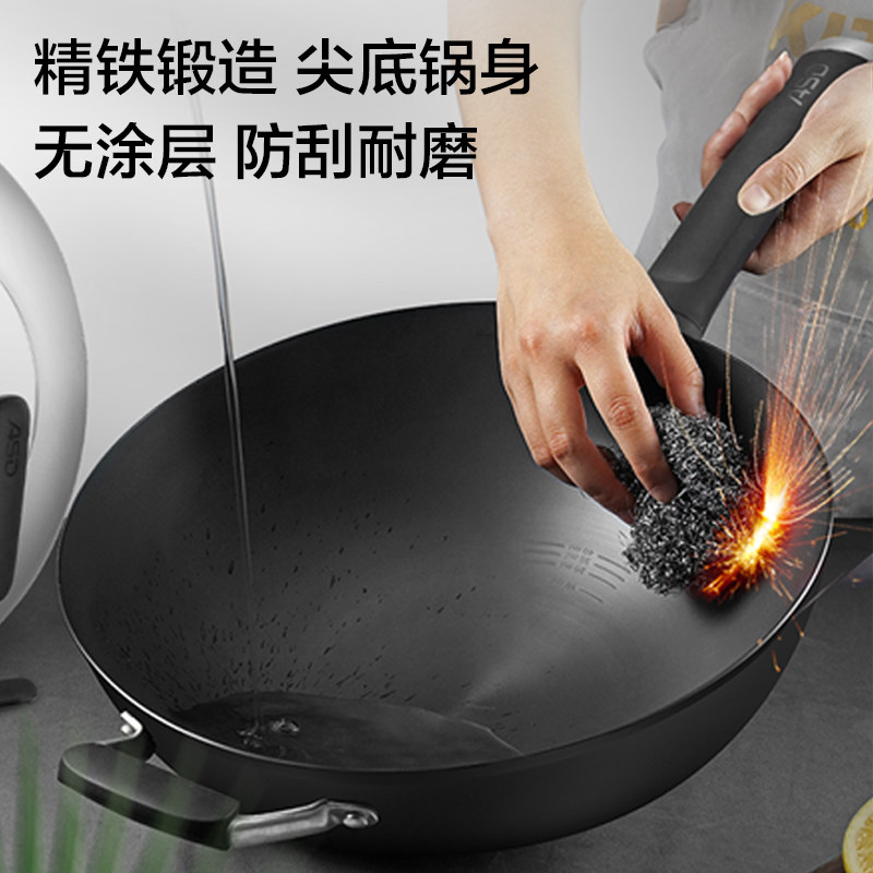 爱仕达炒锅铁锅爆炒不生锈家用无涂层精铁锅圆底煤燃气灶明火专用