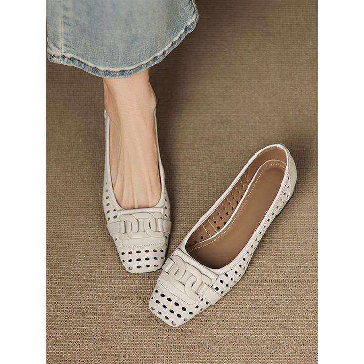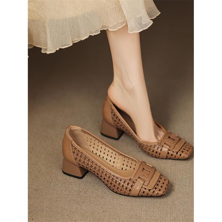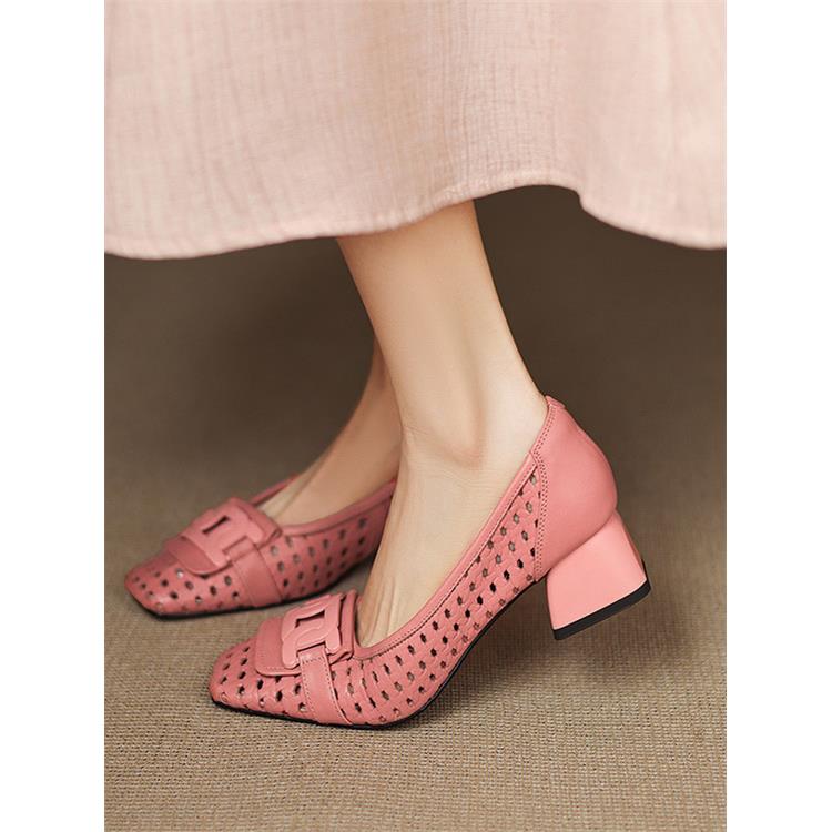 巨好穿法式单鞋女春夏镂空编织方头中跟粗跟真皮40大码41粉色凉鞋